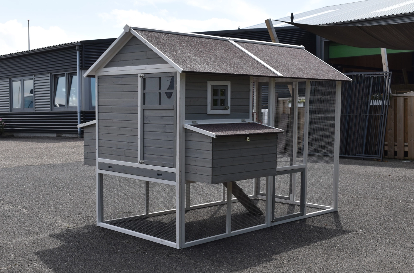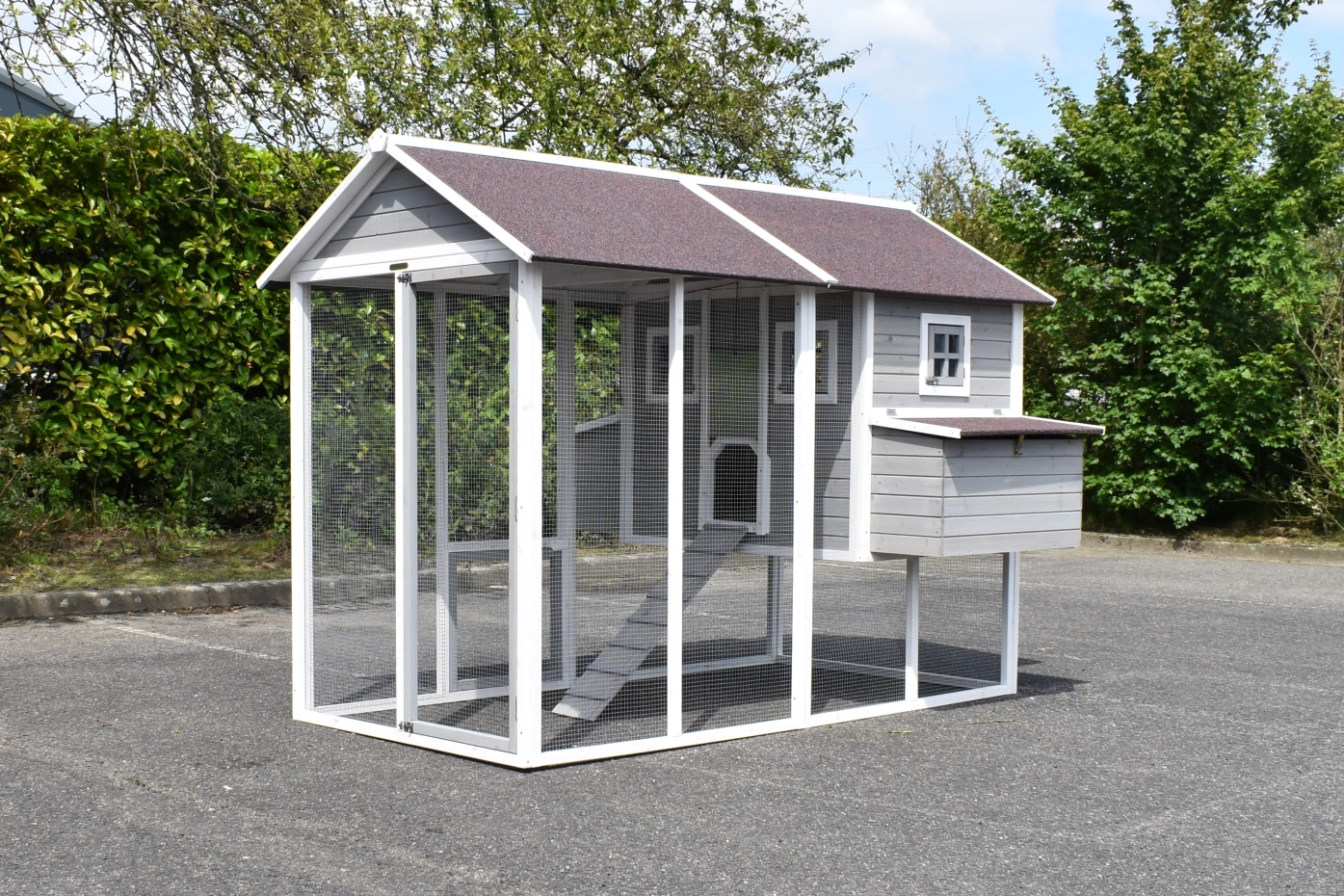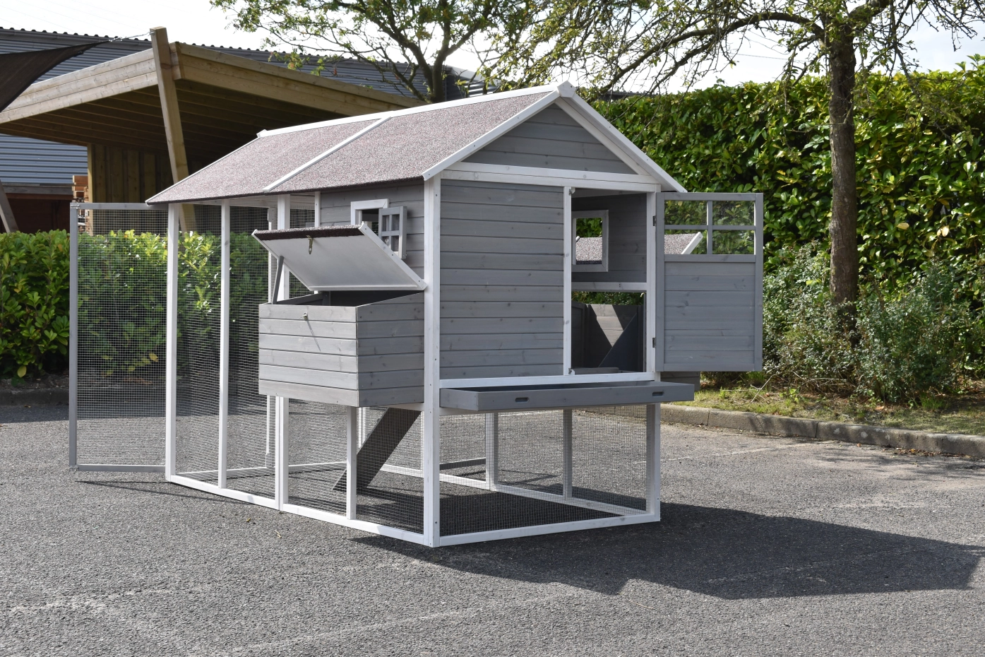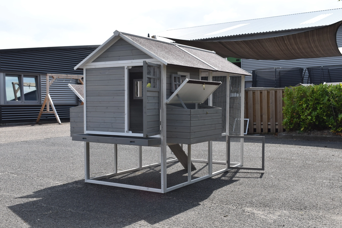 Le grand poulailler Royalty est équipé de deux pondoirs et d’un grand dortoir avec porte arrière. Adapté pour 8 à 14 poules, il offre espace et confort.