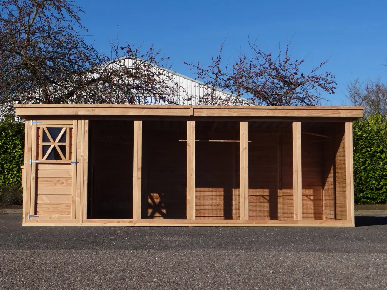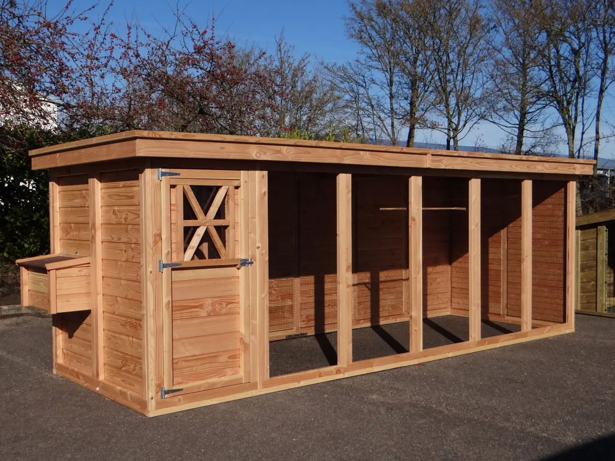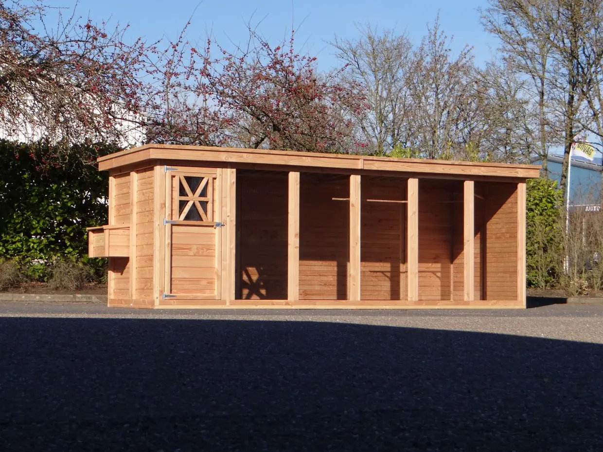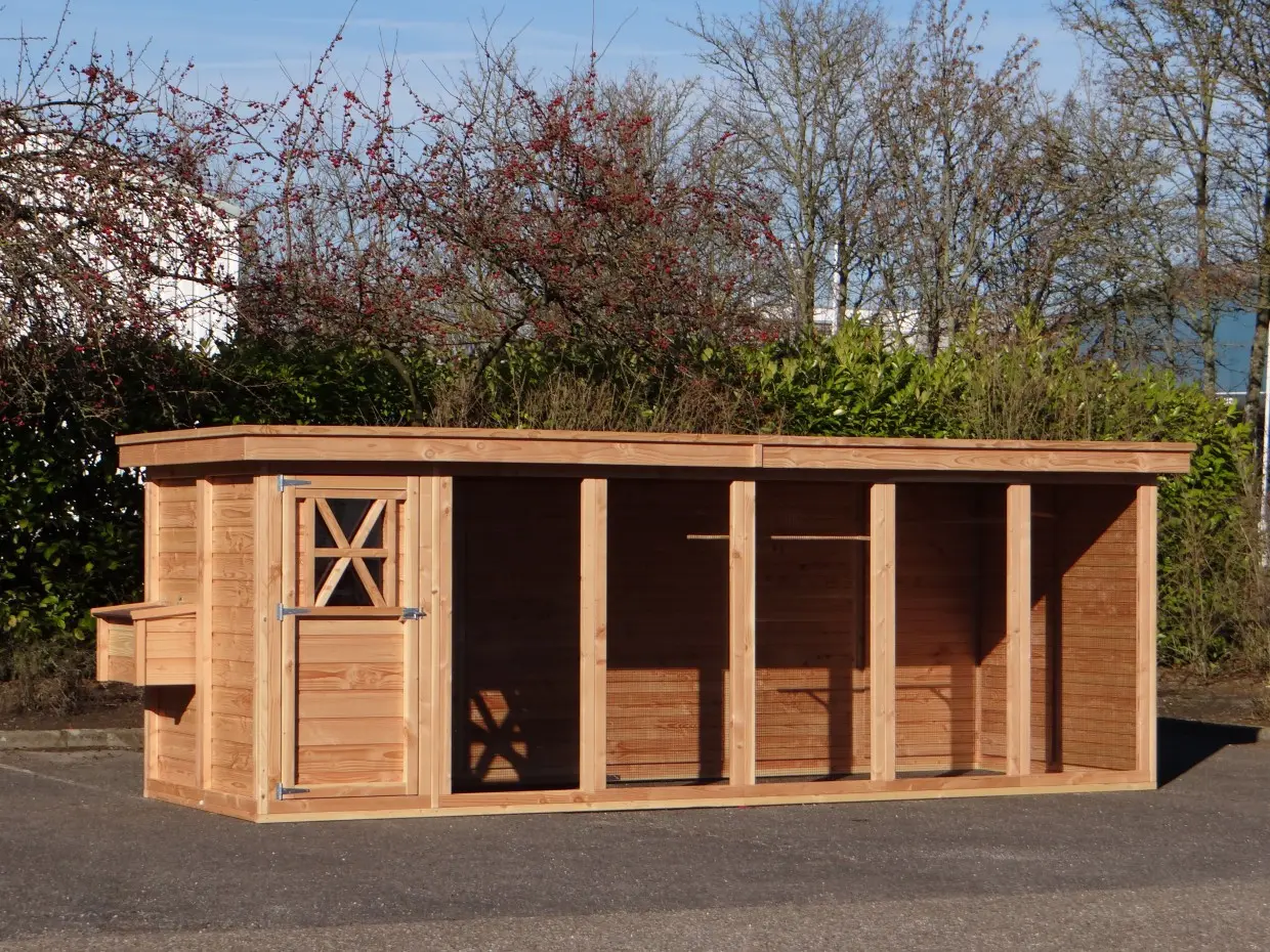 Cette combinaison de luxe, composée d’une volière et d’un poulailler, est la grande version du système unique Flex. L’ensemble offre un vaste espace de vol et de promenade pour les oiseaux et les poules. Il est également très pratique pour l’utilisateur et conçu pour faciliter l’entretien au quotidien.