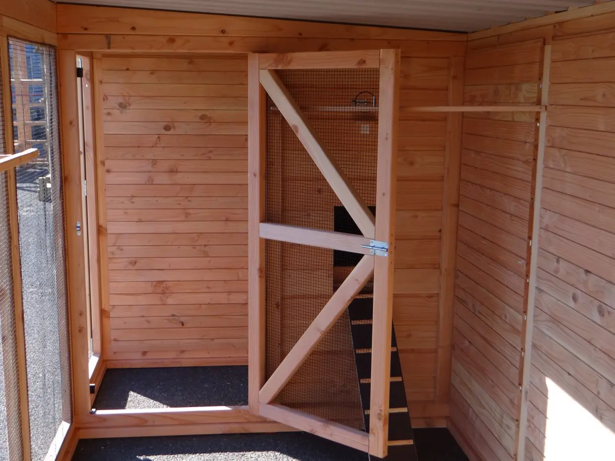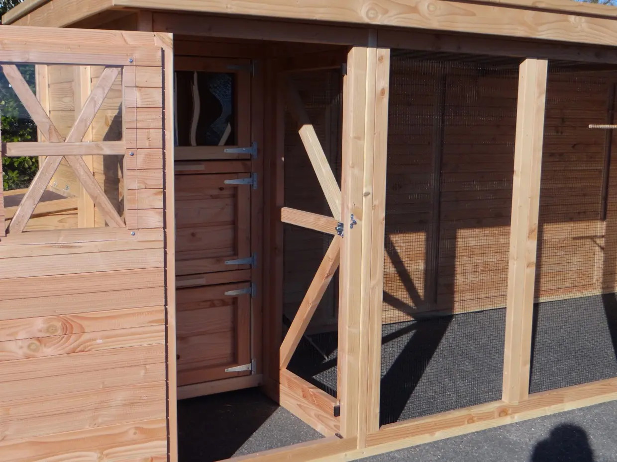 - Avec sas, pour accès sécurisé à la volière. Les portes sont verrouillables de l'intérieur aussi.