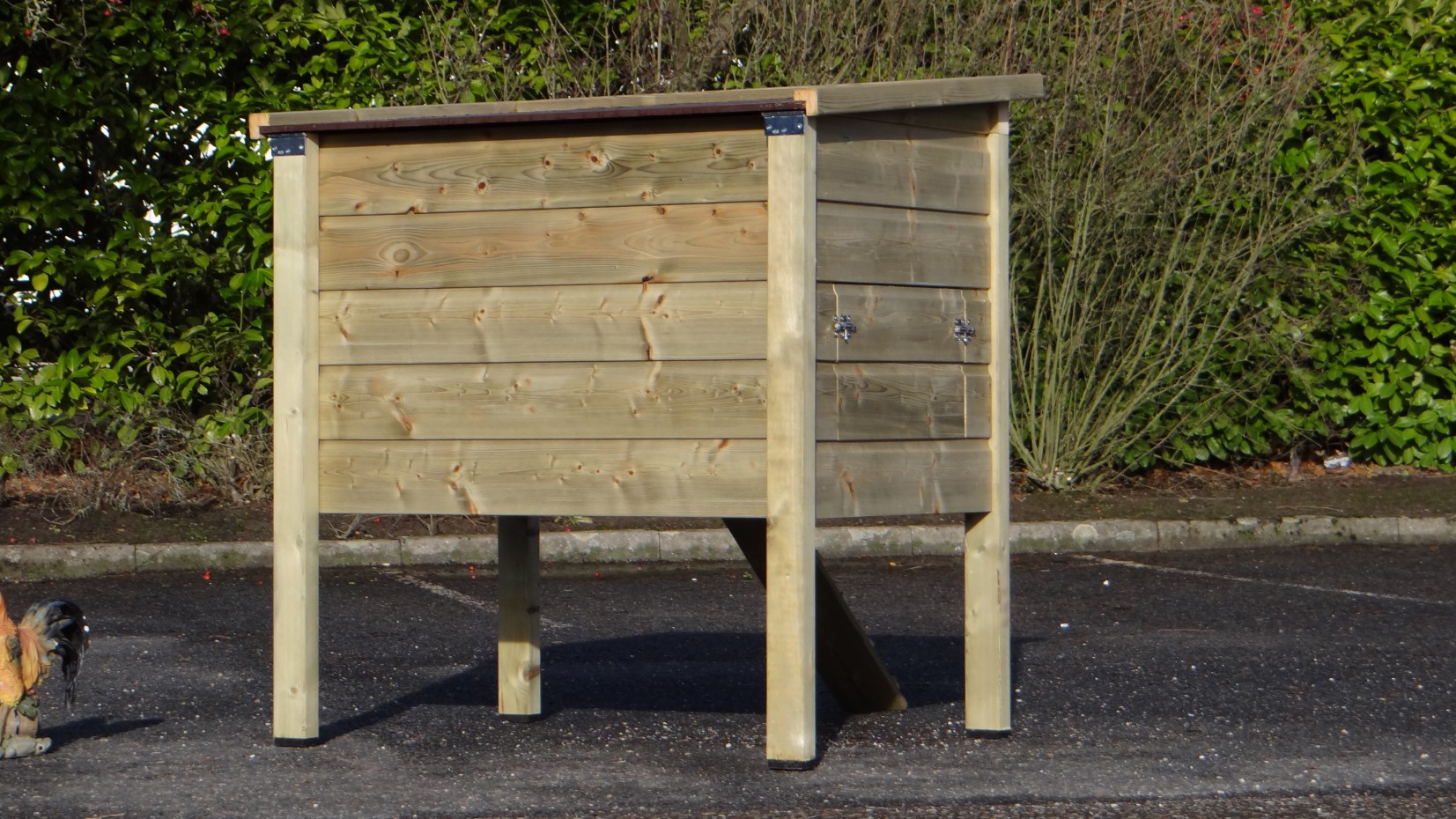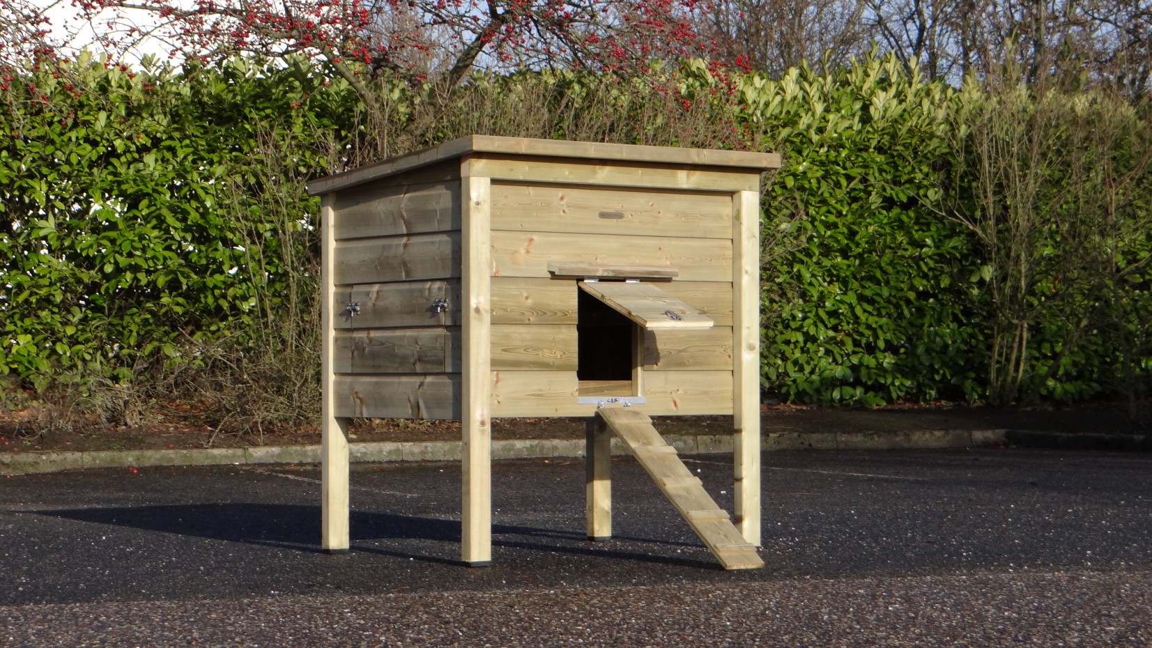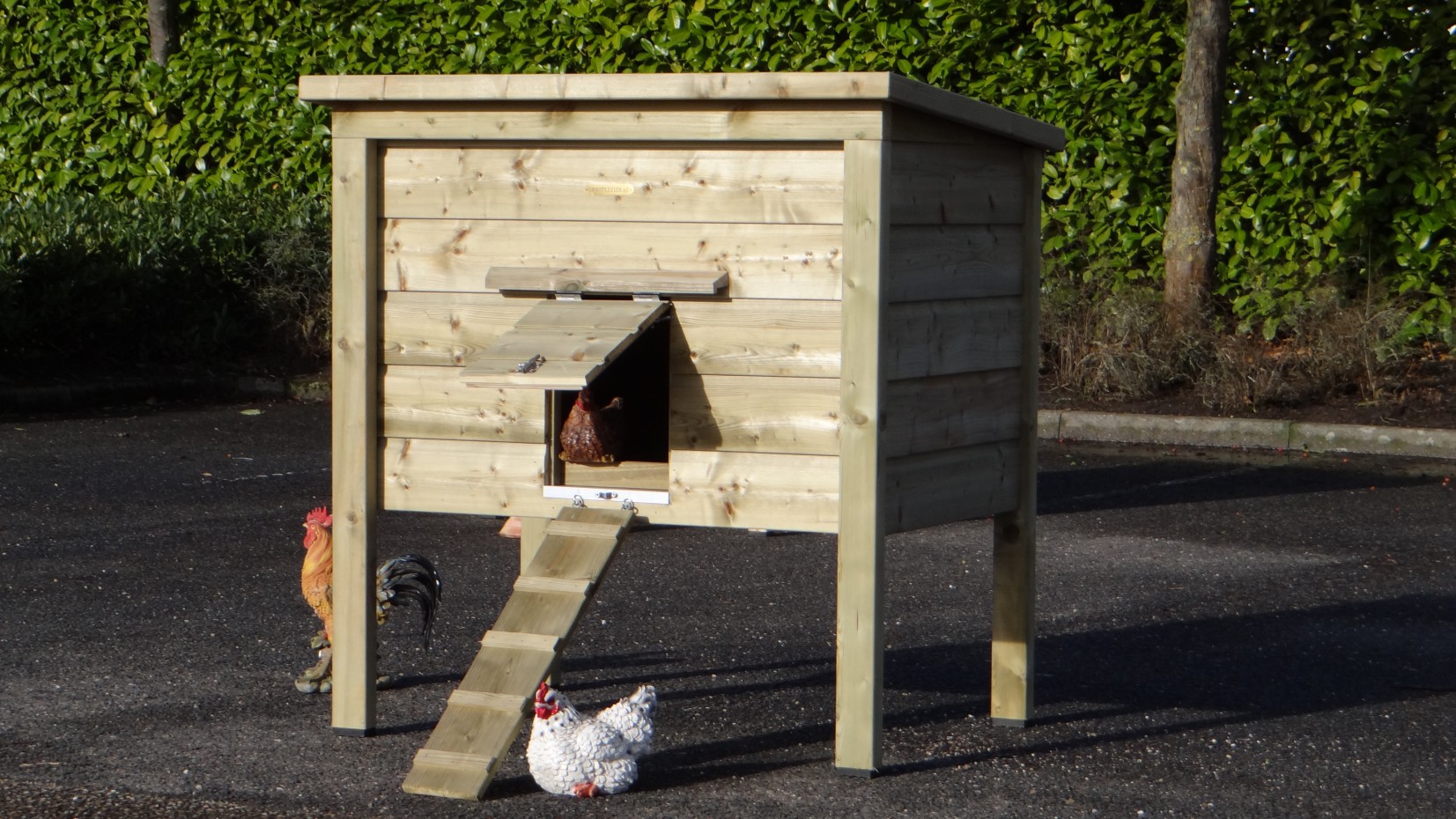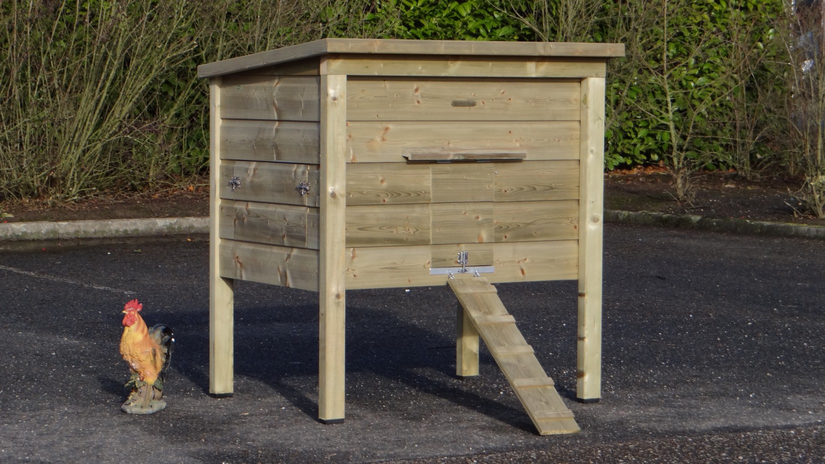 Fabriqué en bois imprégné et en contreplaqué béton, ce poulailler n’a pas besoin d’être peint pour rester solide et résistant aux intempéries.