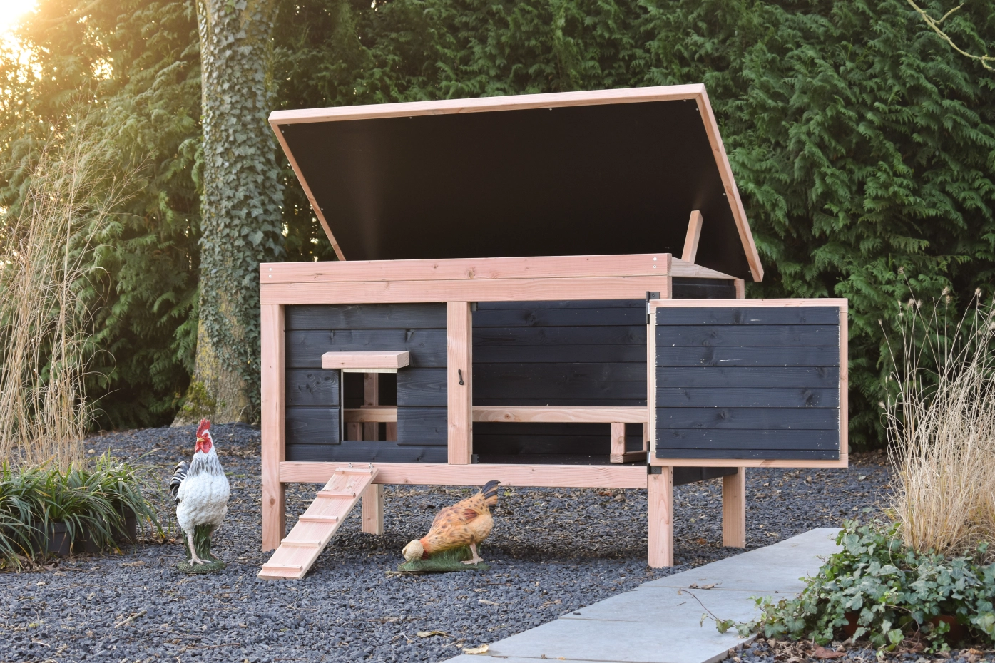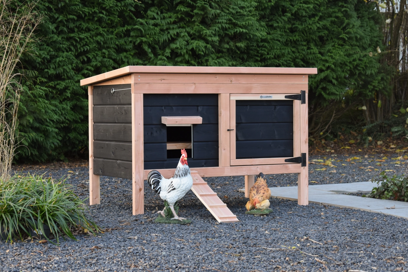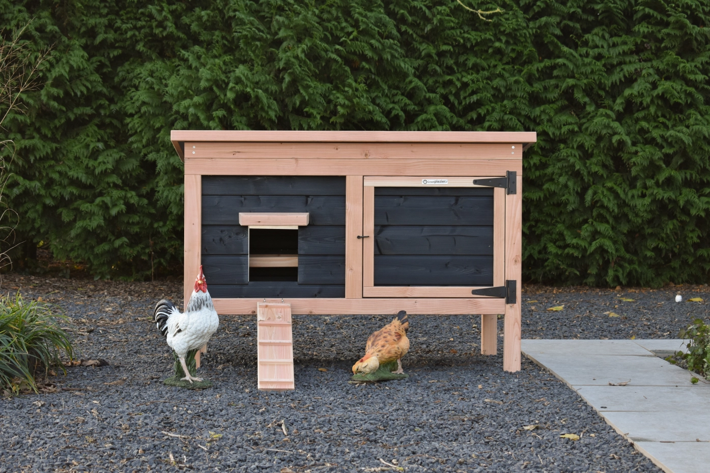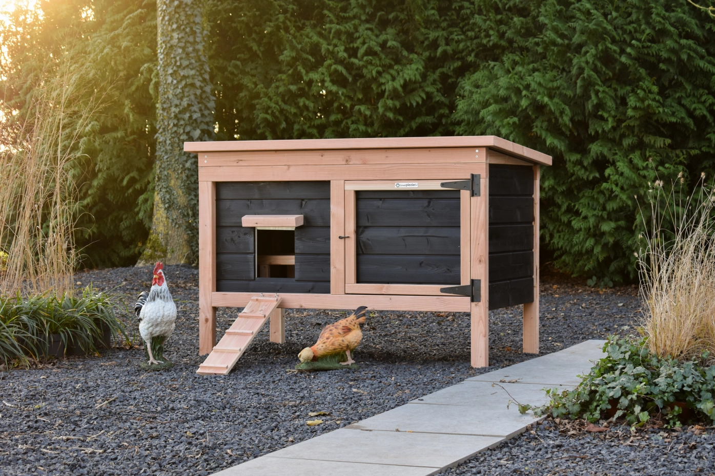 Ce modèle bas est facile à nettoyer grâce à son toit rabattable et à sa porte pratique à l'avant. Le détail charmant d'un coq sur la porte ajoute une touche de caractère au poulailler ! La combinaison du Douglas et du noir donne au clapier une allure chic.