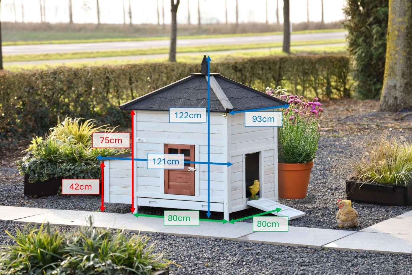| Dimensions extérieures incluant le toit et nichoir (LxPxH) | 121x93x122cm |