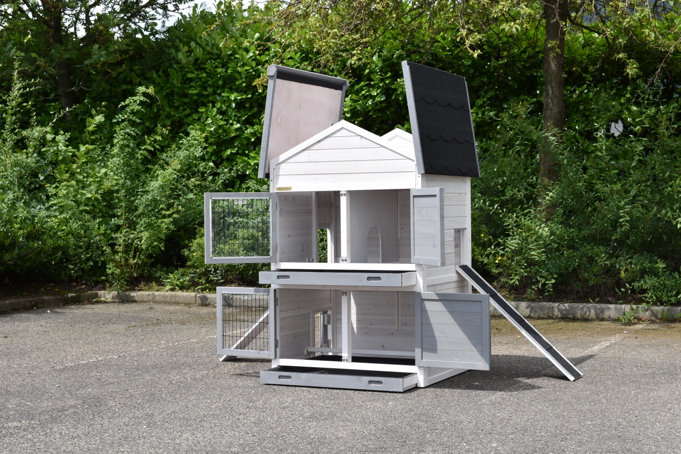 Ce poulailler pratique comprend deux abris nocturnes séparés et verrouillables, équipés de solides tiroirs à déjections en plastique coulissants, de deux perchoirs, de panneaux en plexiglas amovibles, de pieds en caoutchouc et de deux rampes fournies de série.