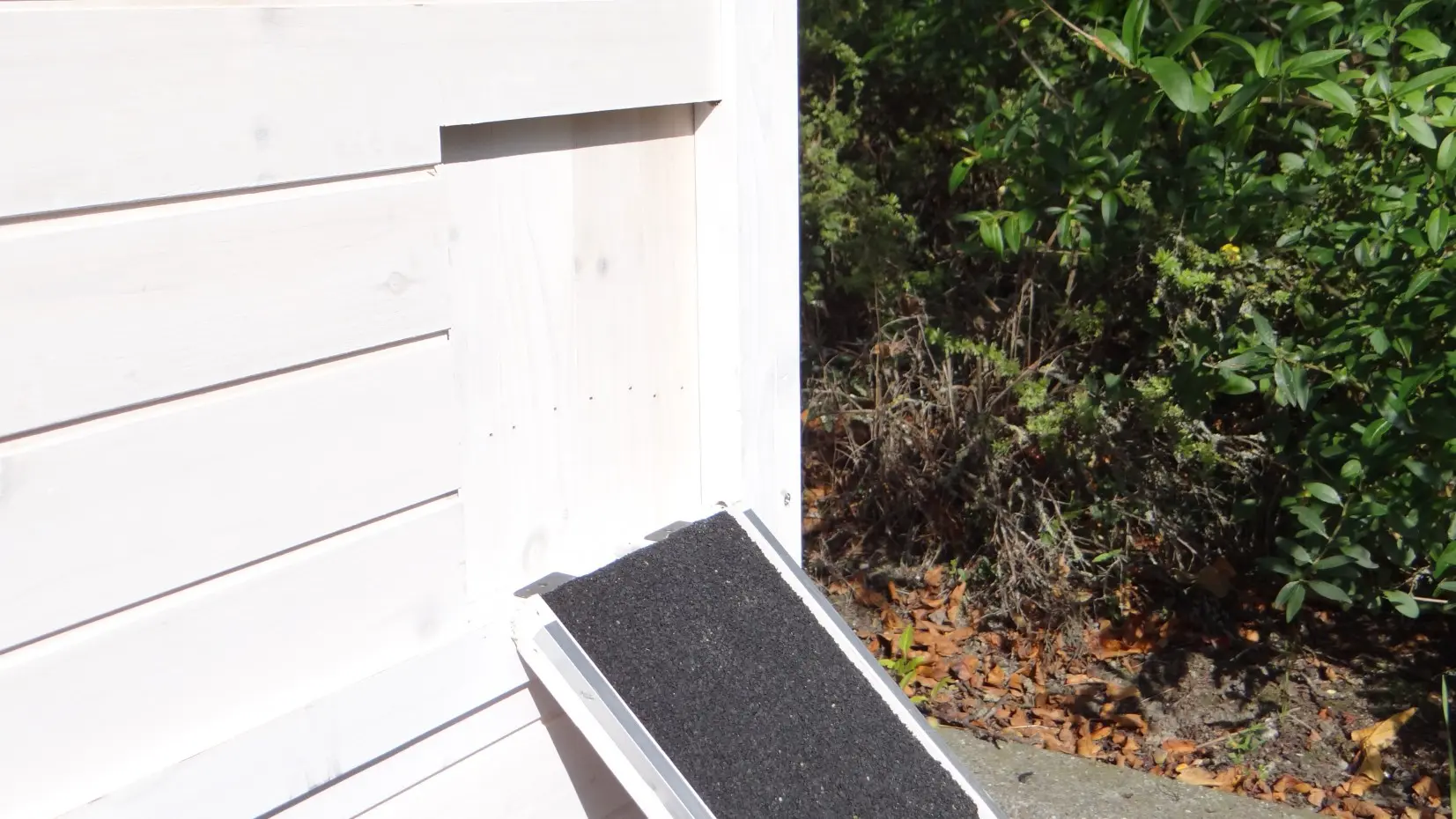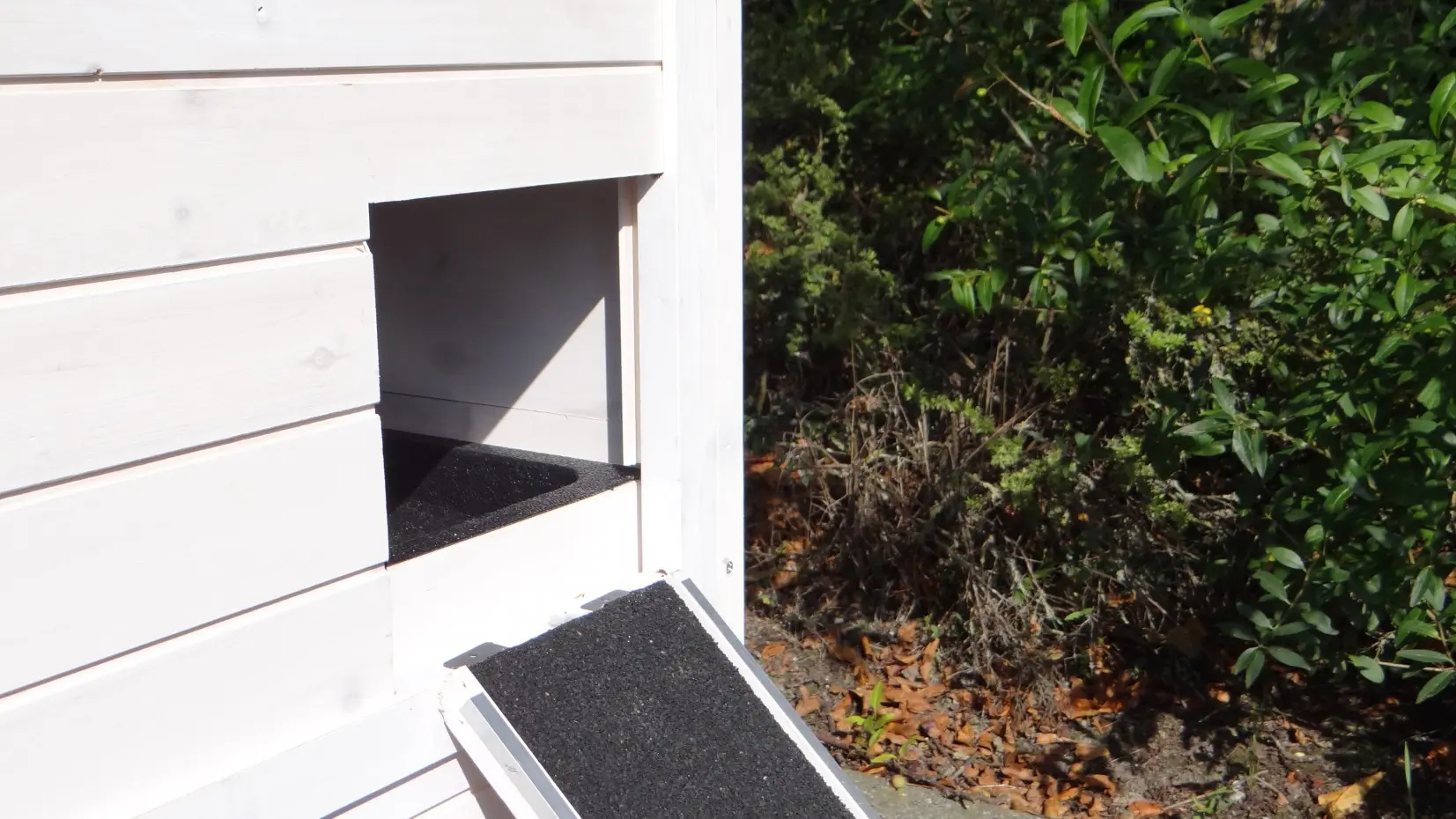 De plus, ce poulailler repose sur des pieds en caoutchouc et est livré de série avec deux rampes.
