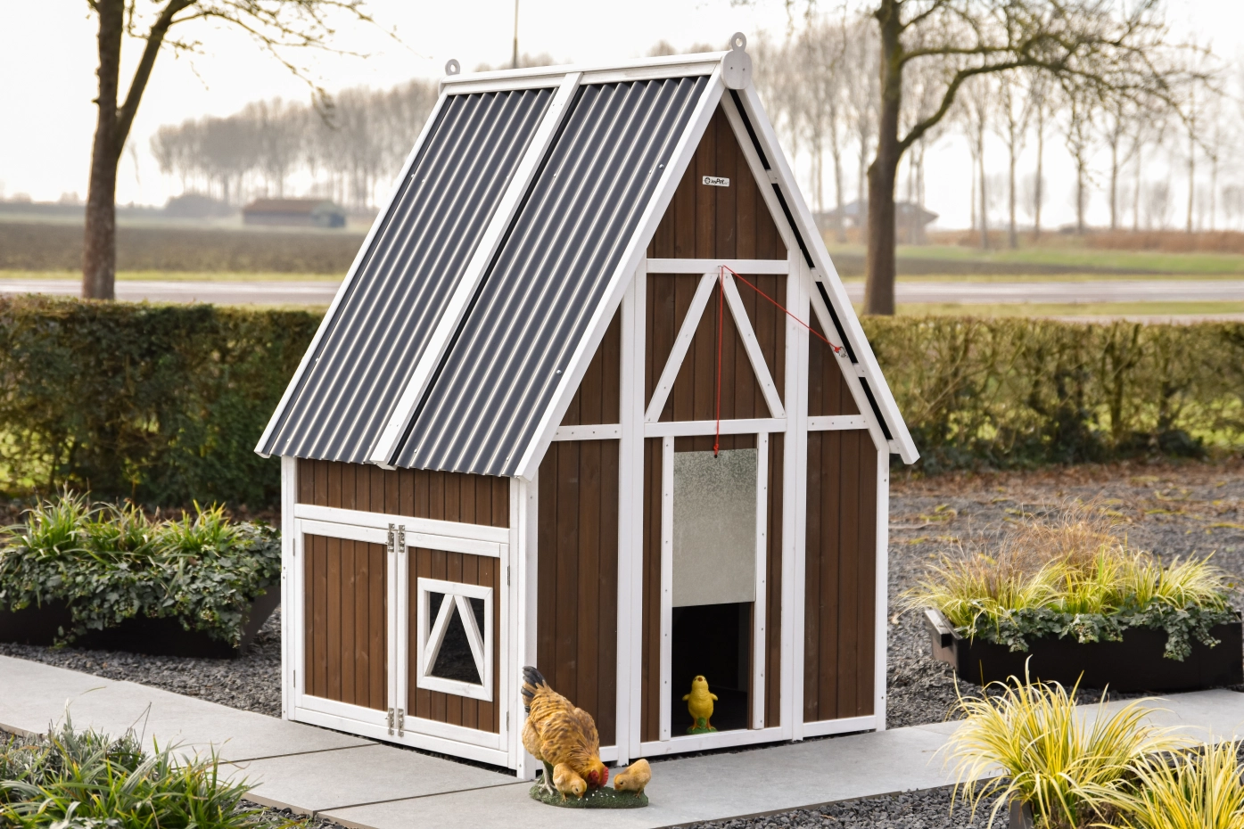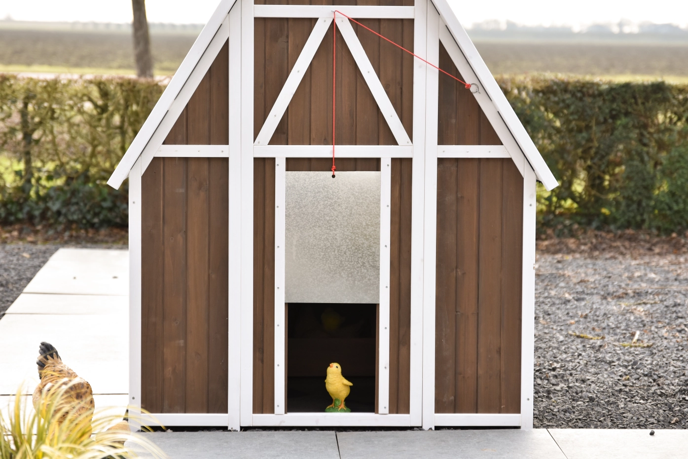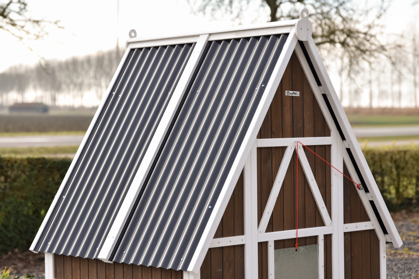 Le poulailler se ferme à l’aide d’une trappe coulissante en aluminium, facile à manipuler avec une corde. Le toit en plaques ondulées en plastique protège efficacement contre la pluie et les autres intempéries.