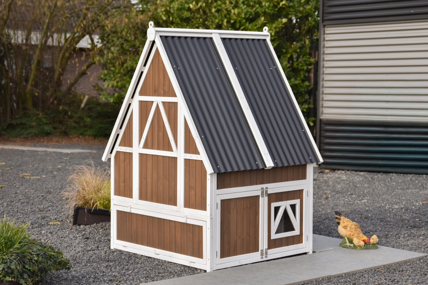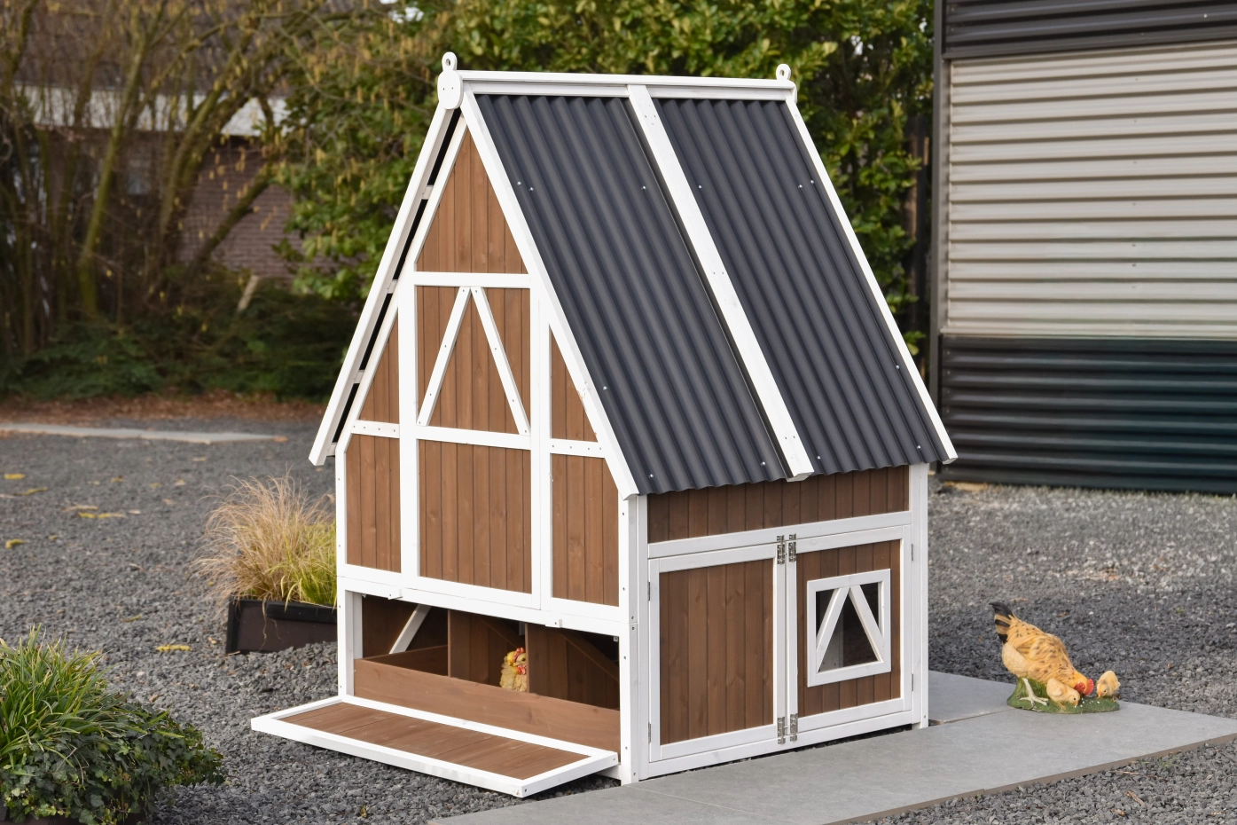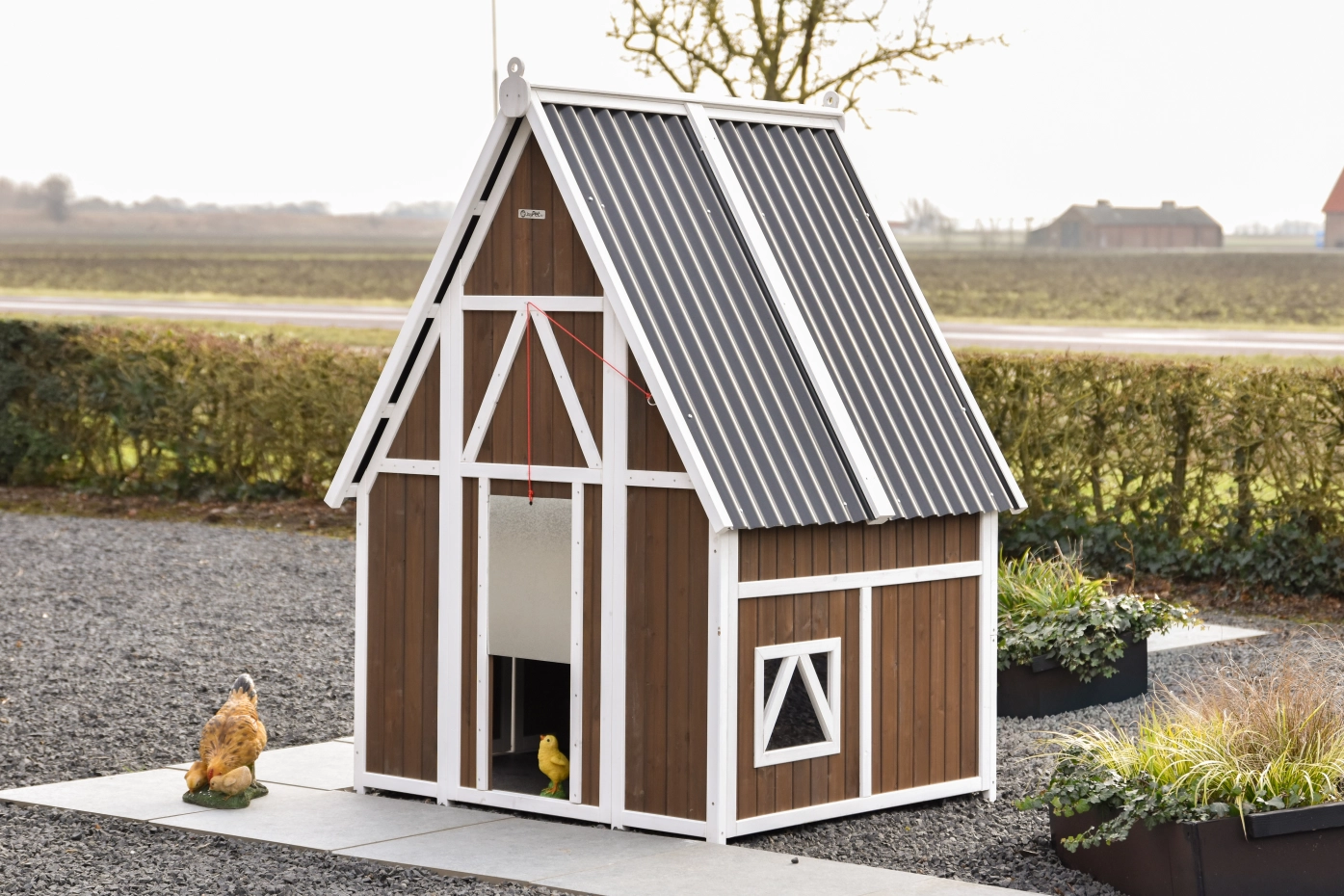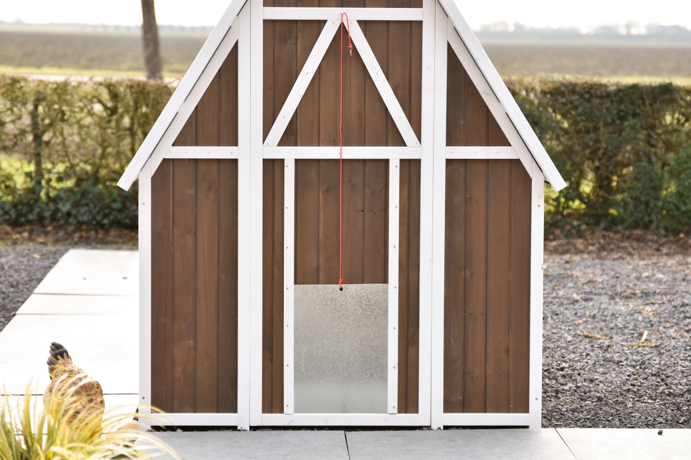 Le poulailler se ferme à l’aide d’une trappe coulissante en aluminium, facile à manipuler avec une corde. Le toit en plaques ondulées en plastique protège efficacement contre la pluie et les autres intempéries.