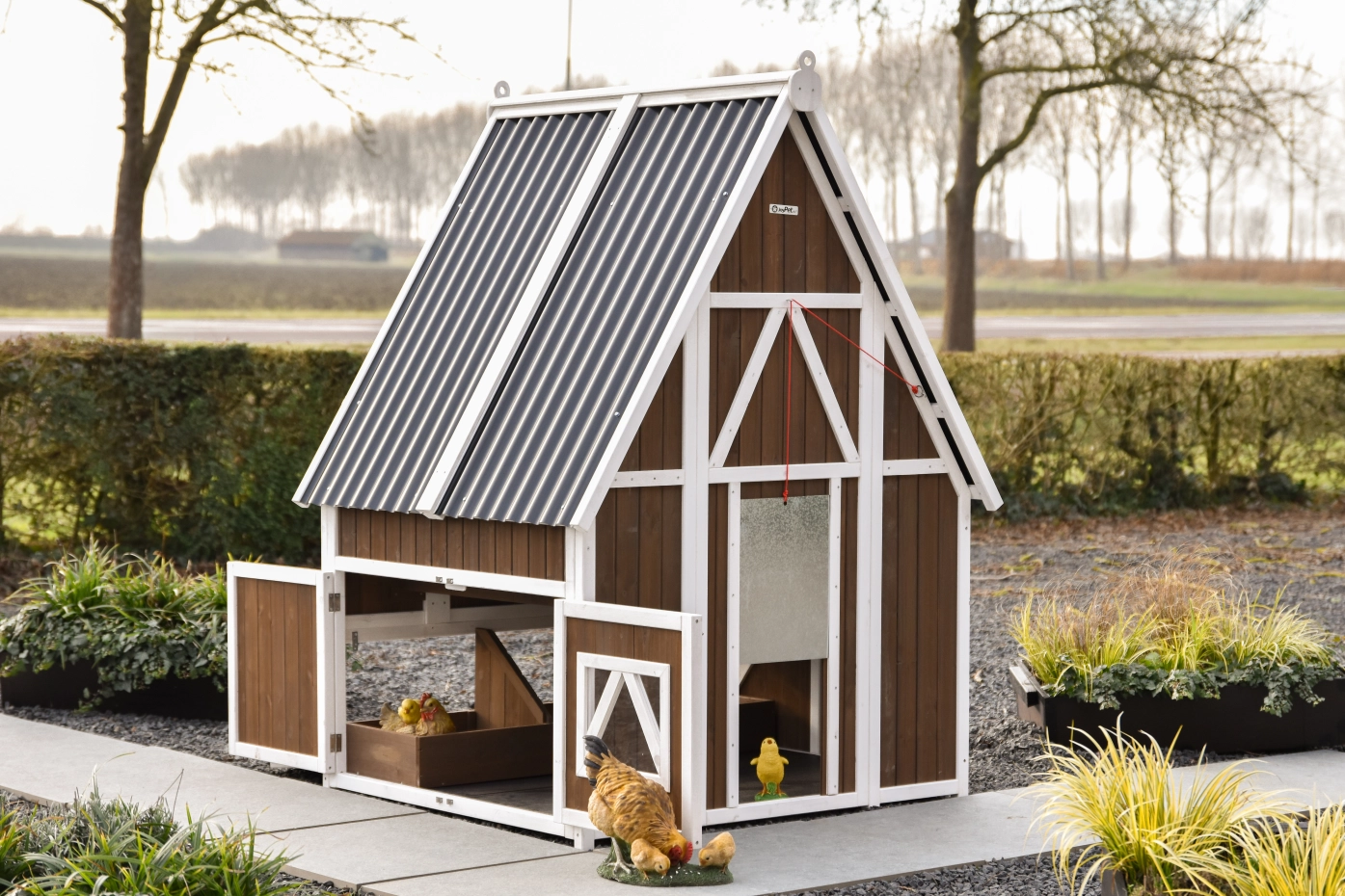 Le poulailler Pip est un grand poulailler confortable avec un toit à pignon classique, adapté pour accueillir de 10 à 20 poules. Comme le poulailler est ouvert jusqu’au faîte, les poules peuvent se percher bien en hauteur et l’espace est utilisé de manière optimale.