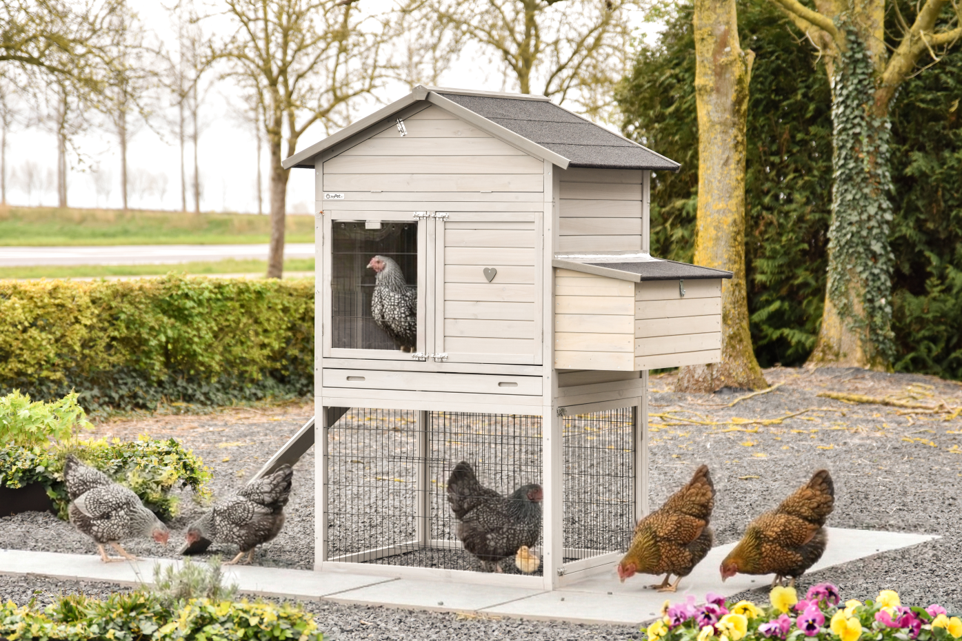 Le grand abri de nuit et le pondoir pratique offrent confort et facilité d’utilisation, tandis que les grandes portes simplifient l’entretien