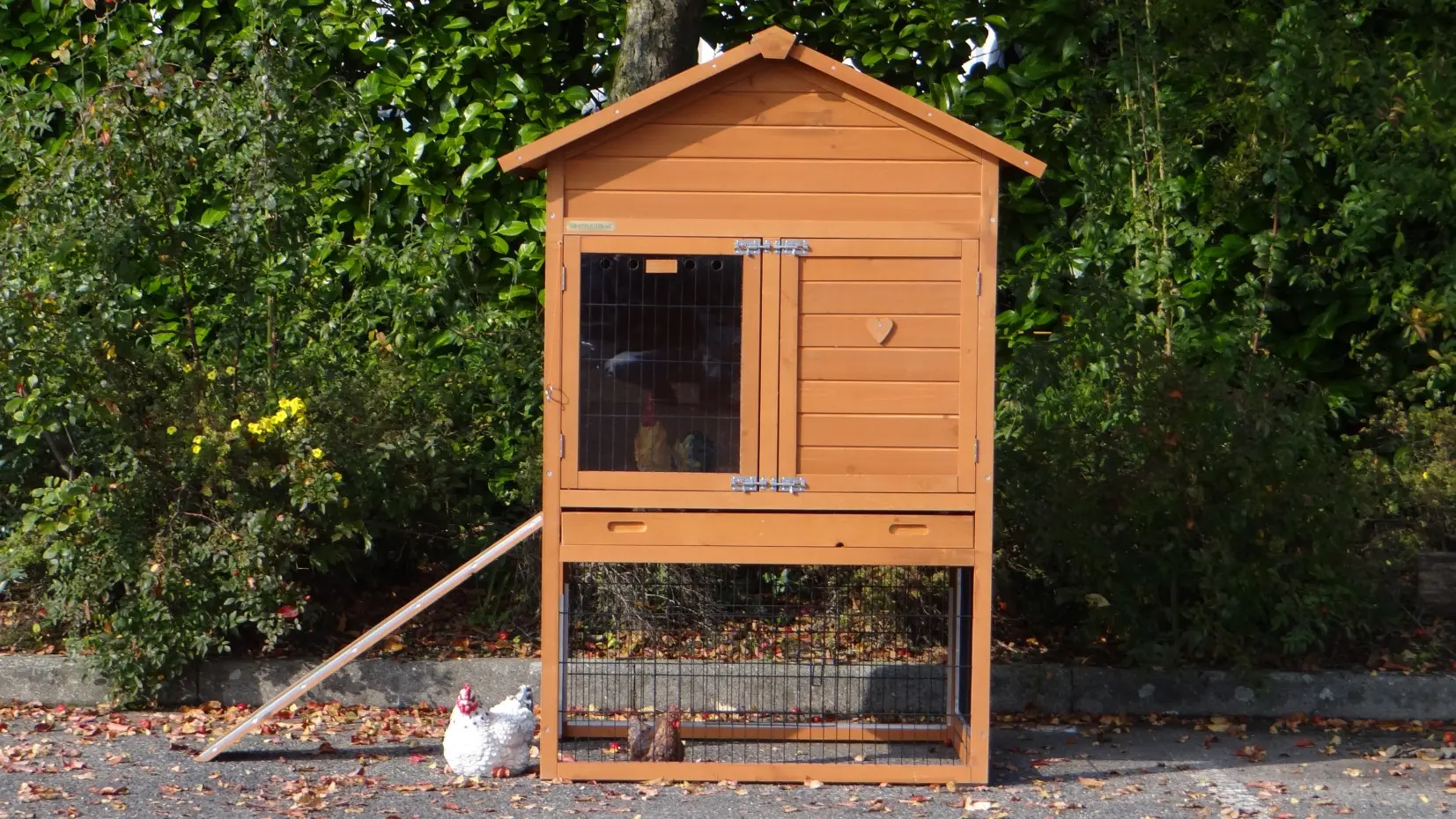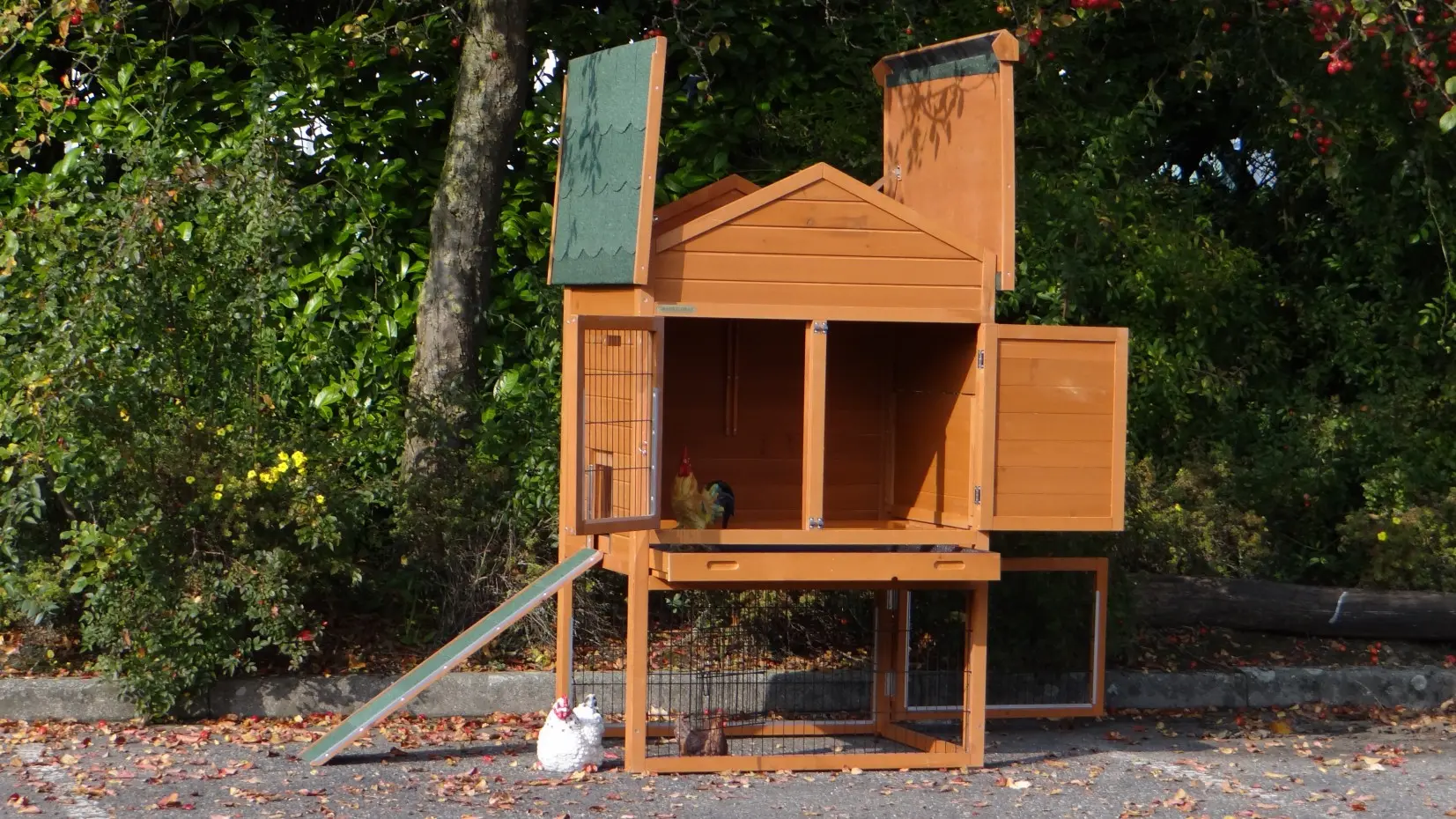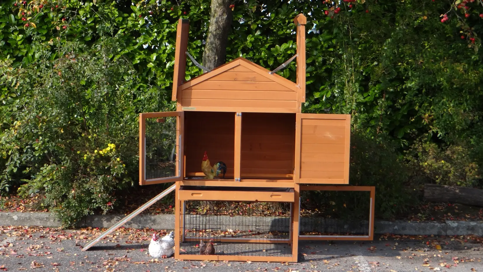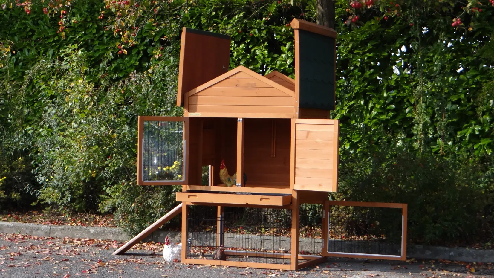 Ce poulailler pratique est fini dans les moindres détails, avec de grandes portes et un vaste abri nocturne équipé de deux perchoirs.