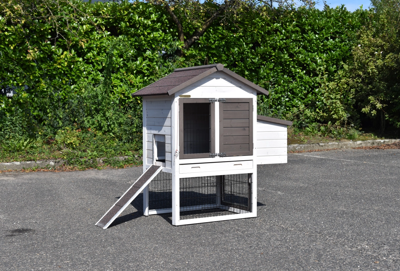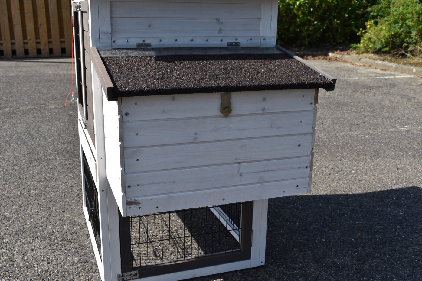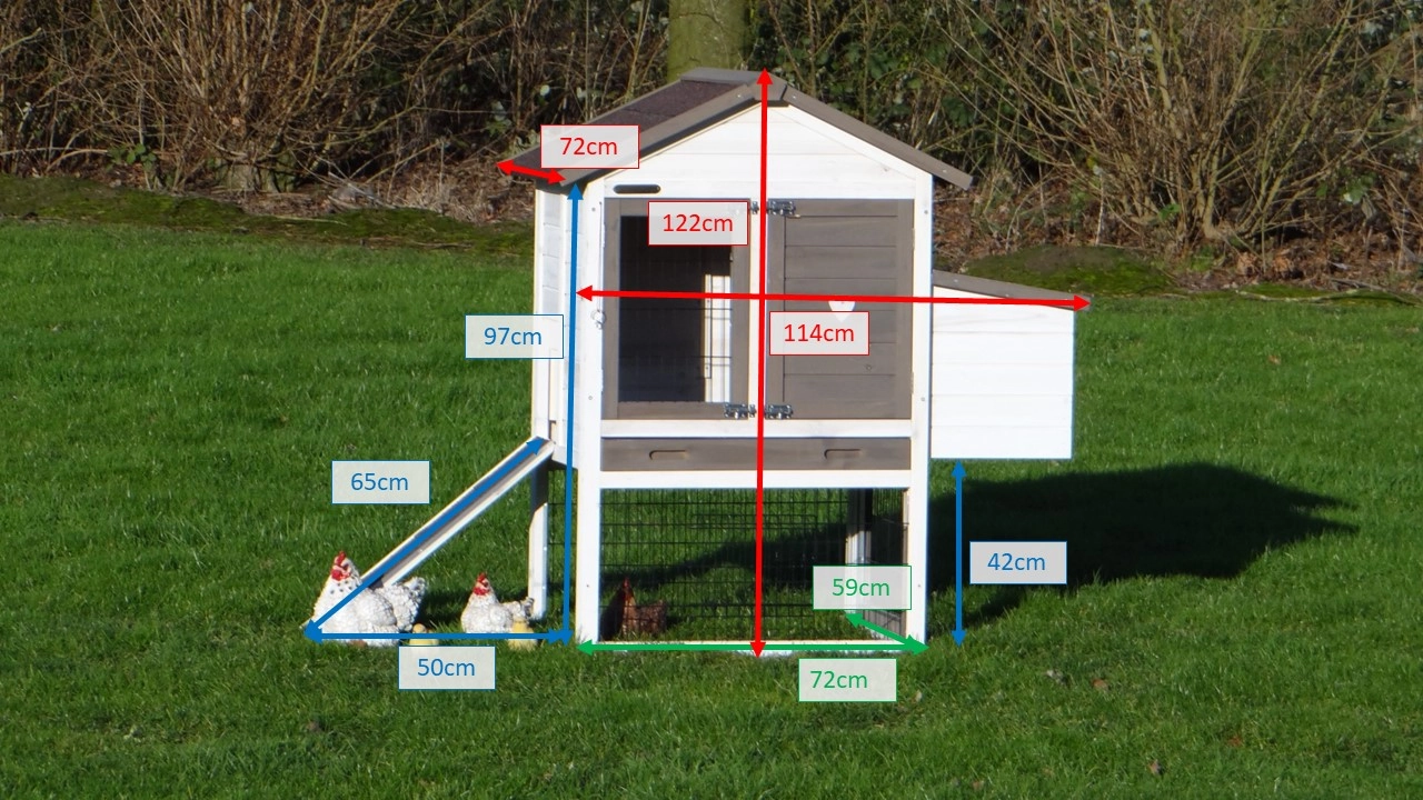 Ce poulailler est fini dans les moindres détails, avec de grandes portes, un tiroir coulissant pratique et un abri nocturne avec un perchoir.