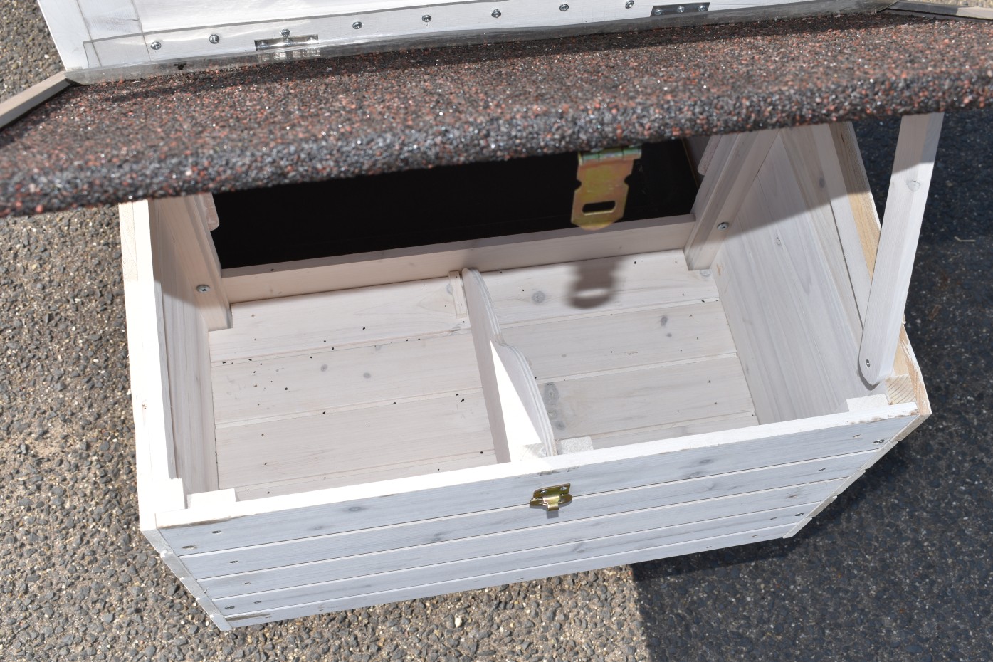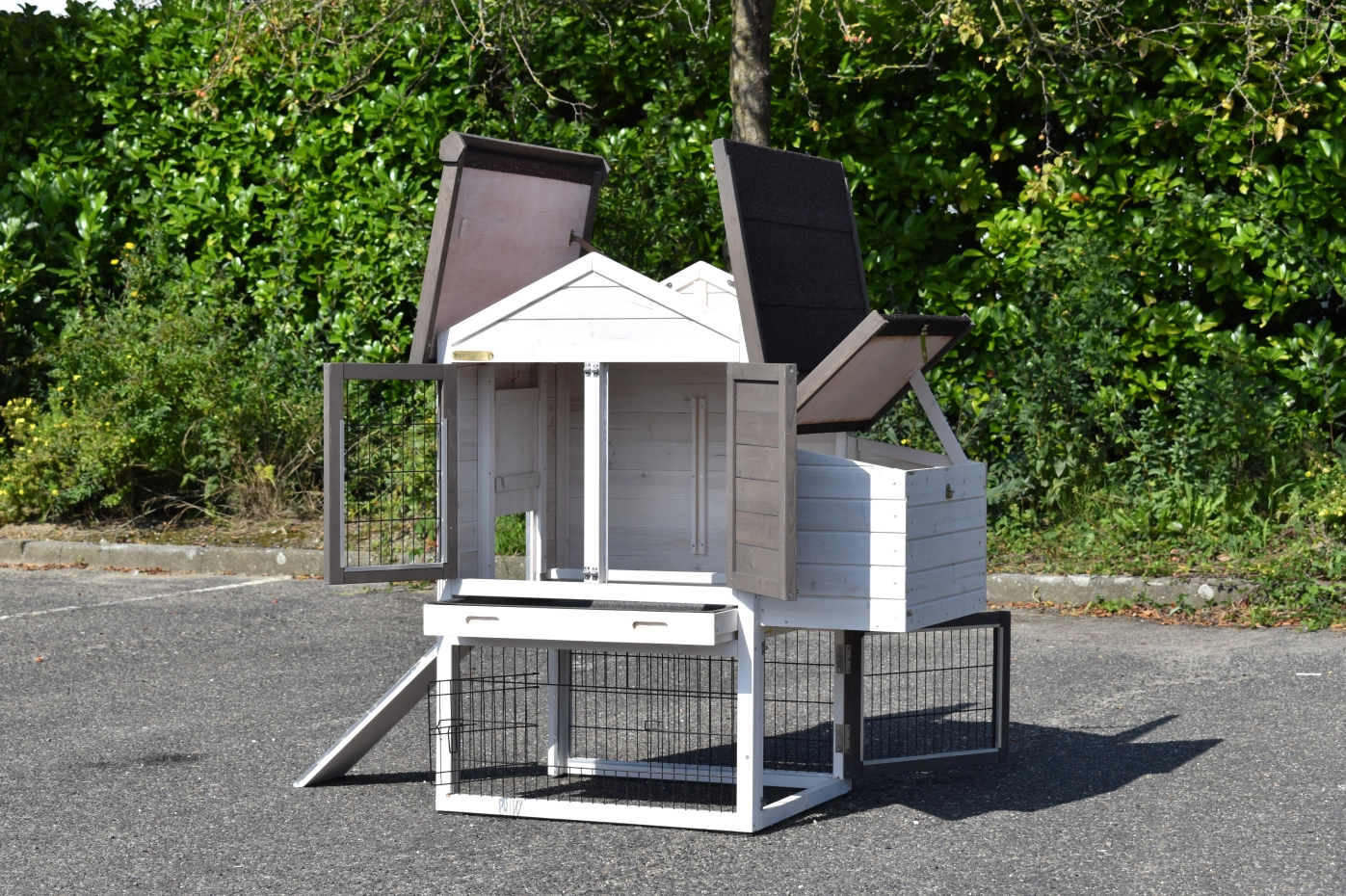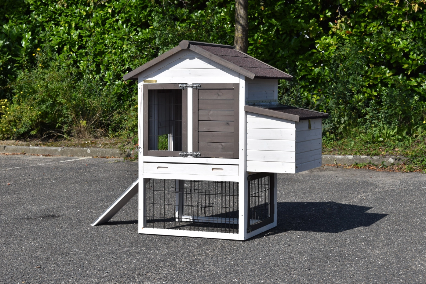 Ce poulailler est fini dans les moindres détails, avec de grandes portes, un tiroir coulissant pratique et un abri nocturne avec un perchoir.