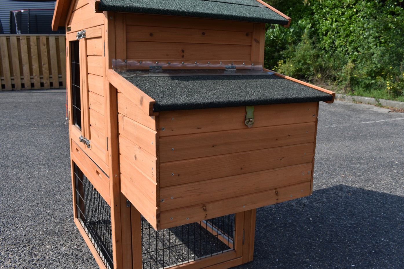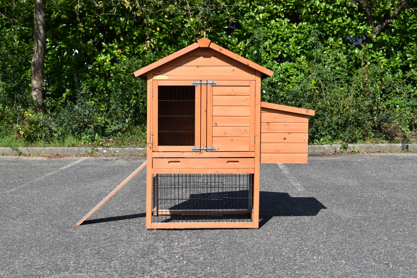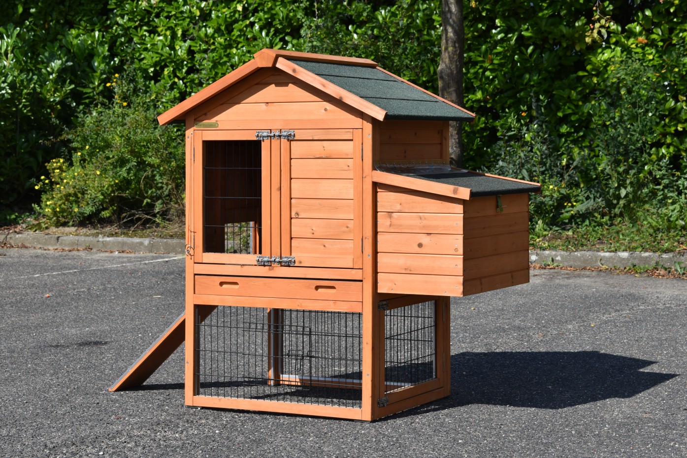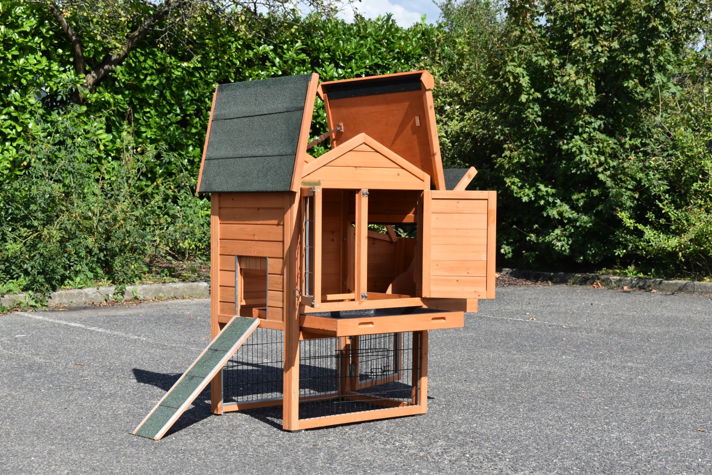 Ce poulailler est fini dans les moindres détails, avec de grandes portes, un tiroir coulissant pratique et un abri nocturne avec un perchoir.