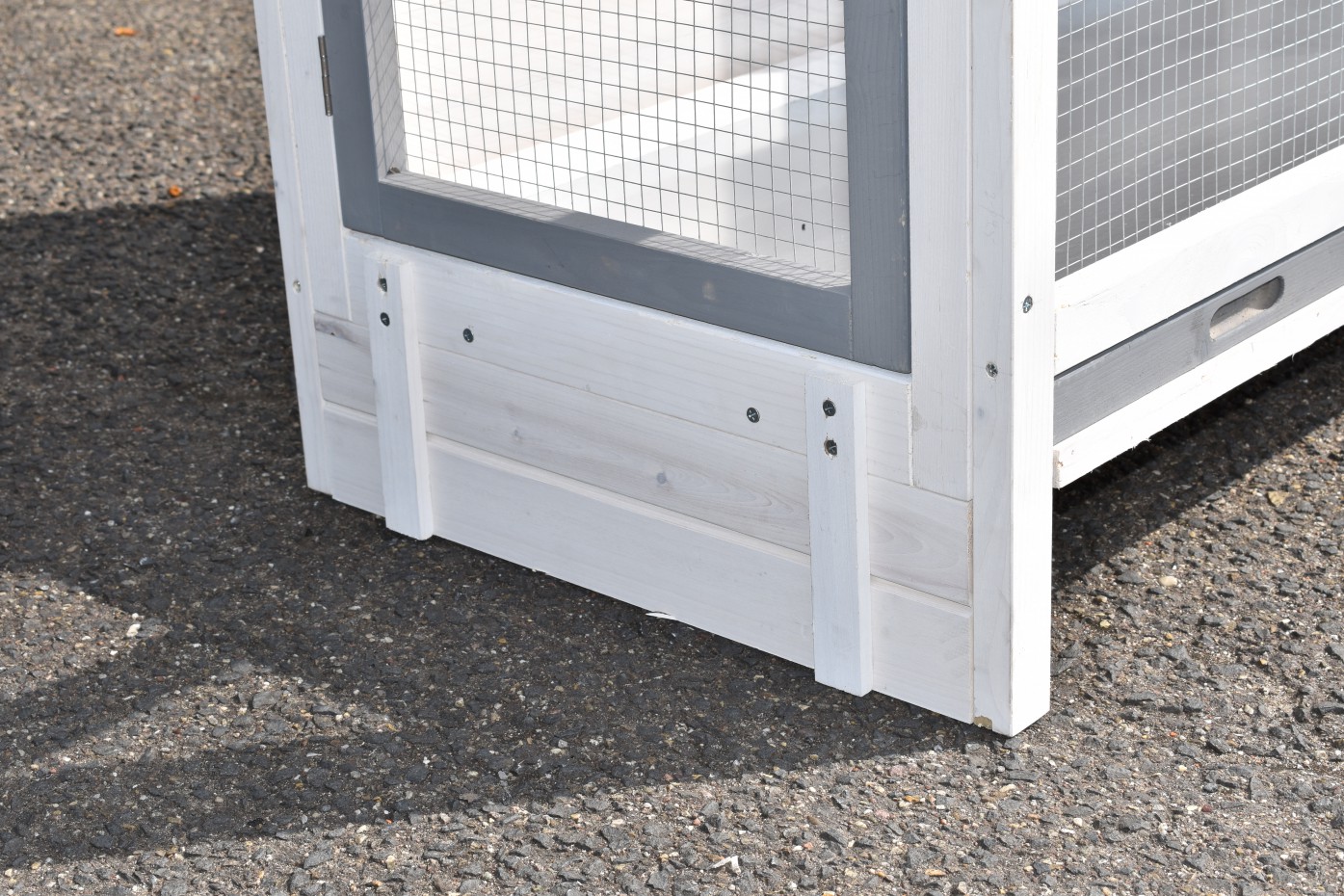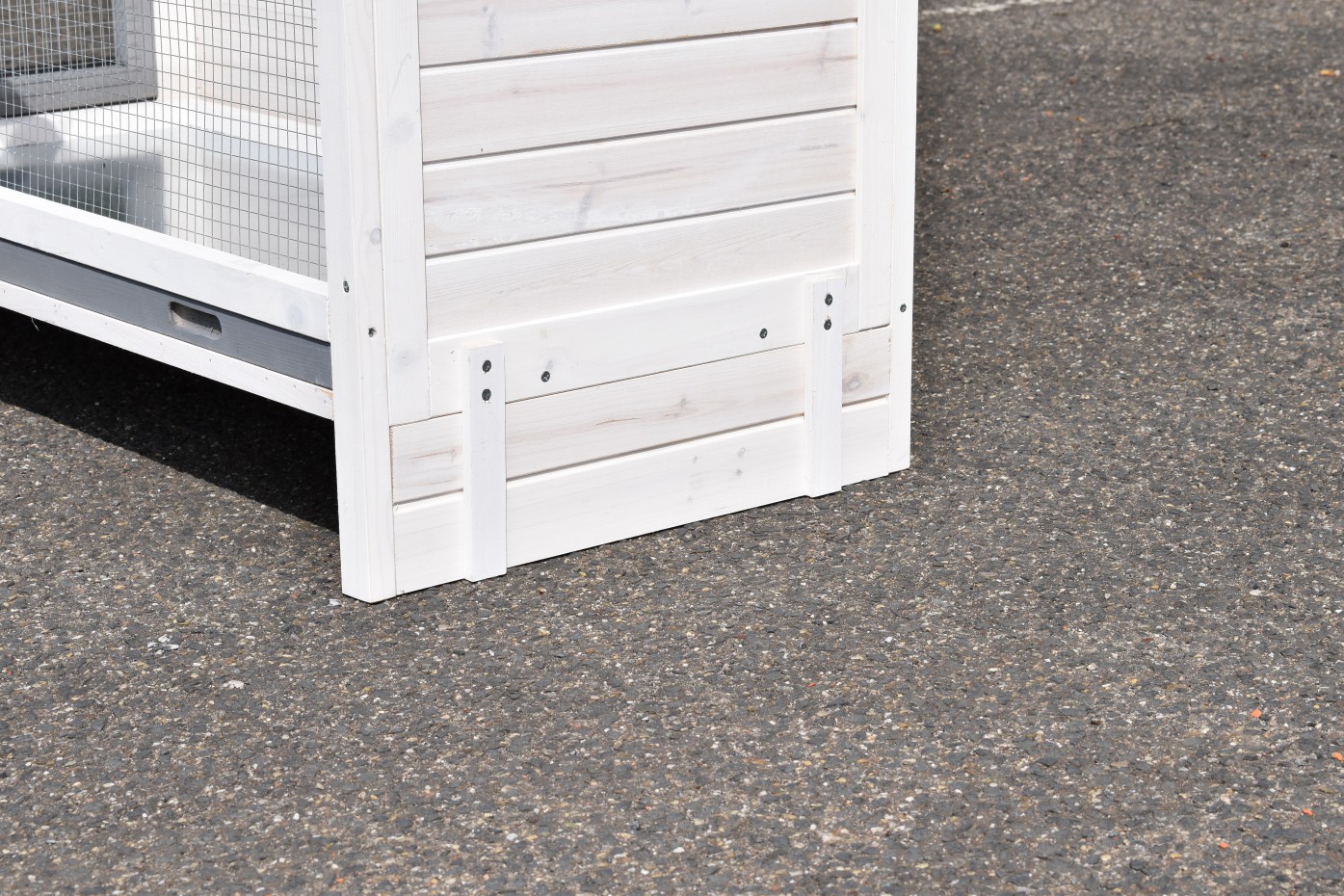 Il est conseillé de traiter périodiquement les charnières et les serrures avec un spray en silicone ou un spray pour serrures pour éviter la rouille et la corrosion. Si l'animal n'est pas dans un endroit abrité, nous vous conseillons d'ancrer l'enclos.