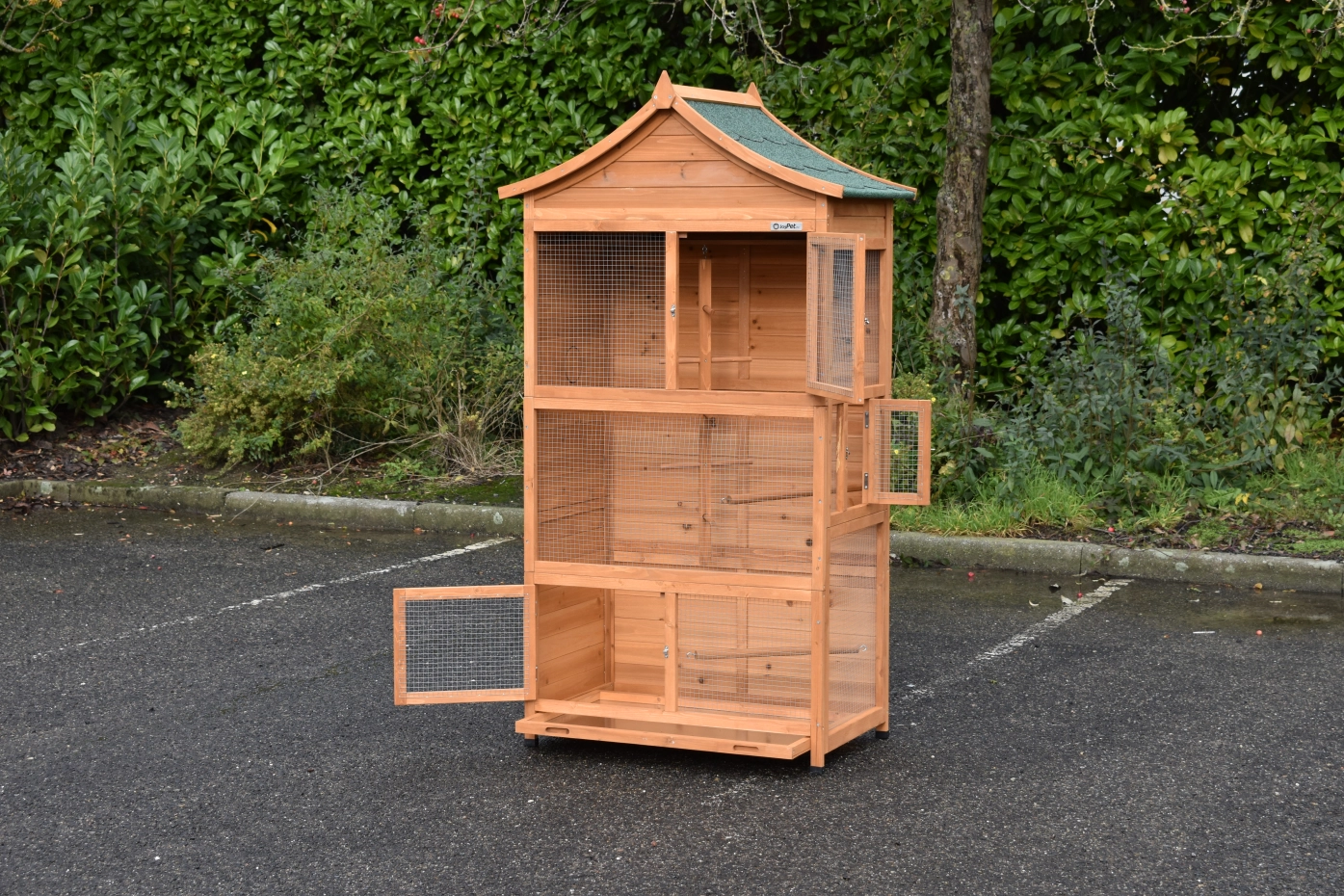 La Volière Julio, fabriquée en magnifique bois de pin, offre un environnement de vie confortable et pratique pour les oiseaux. Avec son tiroir à déjections extractible et ses portes pratiques, la Volière Julio est conçue pour la commodité des propriétaires. Elle comprend également des abris nocturnes pour les oiseaux. Veuillez noter que lorsque le tiroir à déjections est retiré, la volière n'a plus de fond.