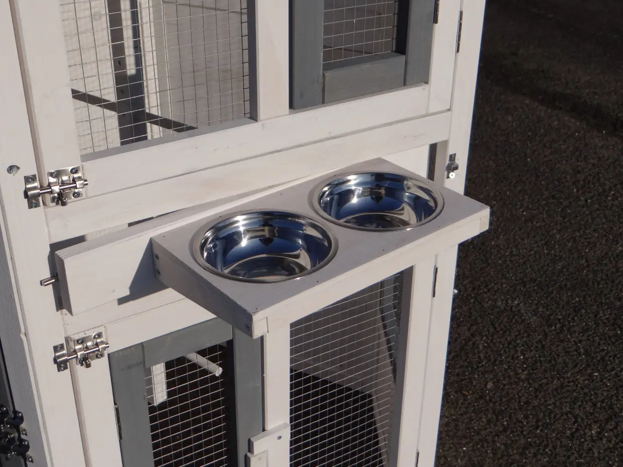 Il est conseillé de traiter périodiquement les charnières et les serrures avec un spray en silicone ou un spray pour serrures pour éviter la rouille et la corrosion. Si l'animal n'est pas dans un endroit abrité, nous vous conseillons d'ancrer l'enclos.