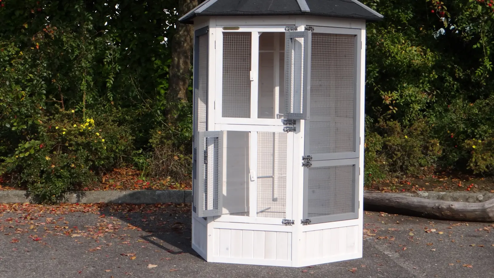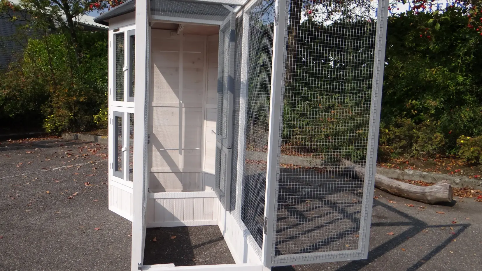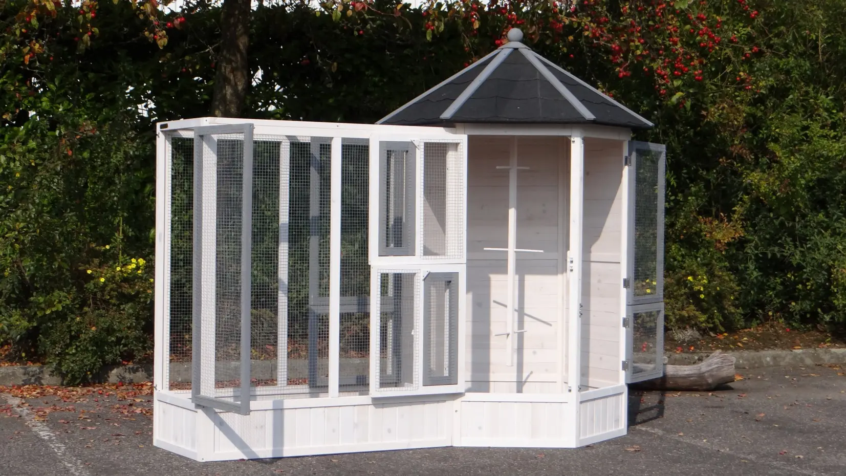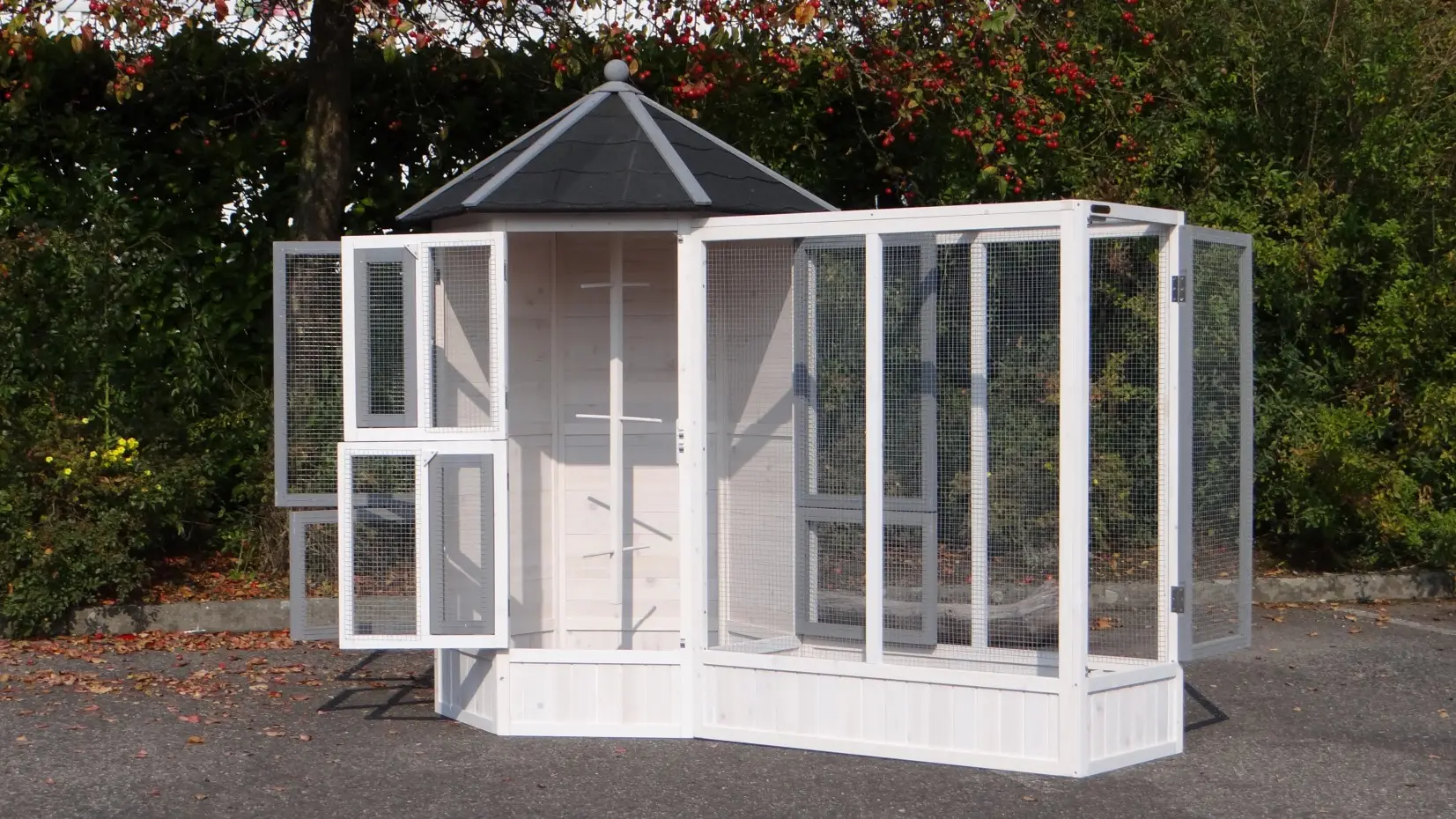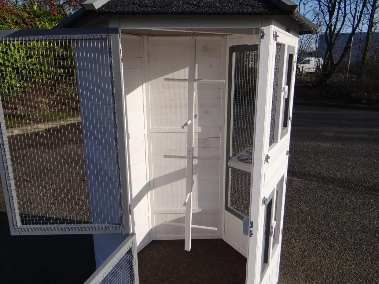 - Cette volière est équipée de 6 plus grandes et 2 petites portes pratiques