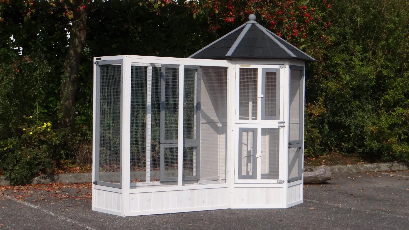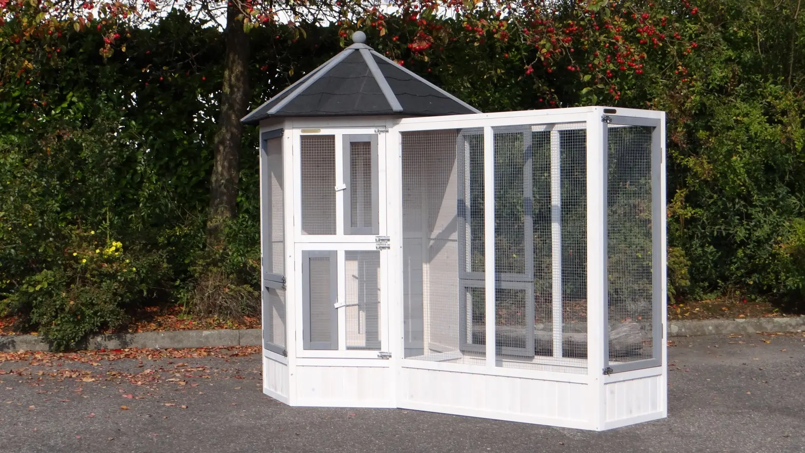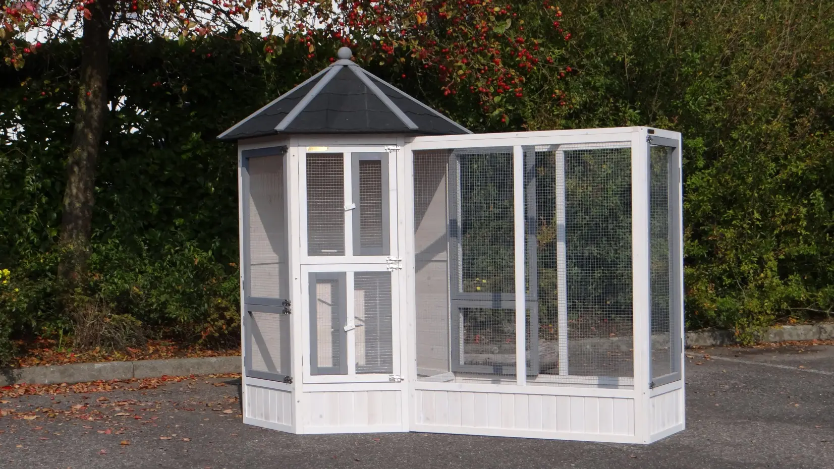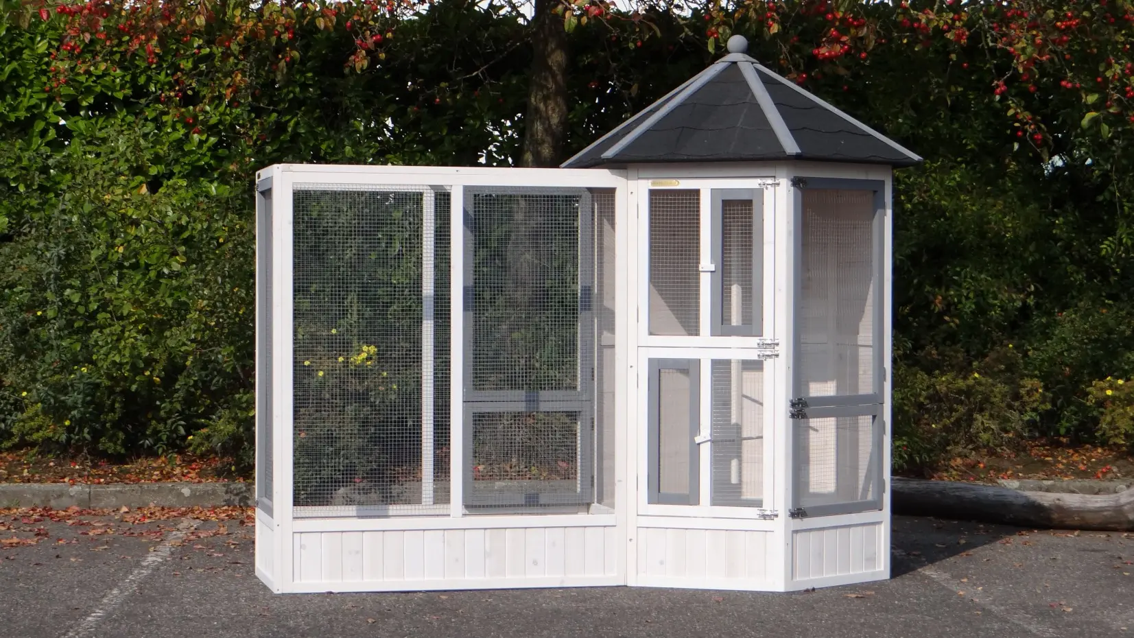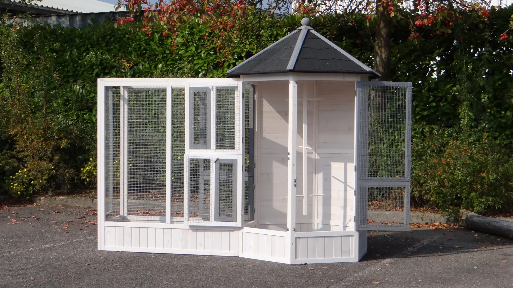 La volière hexagonale Hannah, associée à son enclos d’extension, offre un magnifique et vaste espace de vie pour vos oiseaux. Grâce à son mangeoire rotative à deux bols, ses nombreuses grandes et petites portes, ses deux nichoirs et ses cinq perchoirs, elle assure un confort optimal. Cet ensemble peut être agrandi à l’infini et existe aussi en version plus grande : la volière Evy.