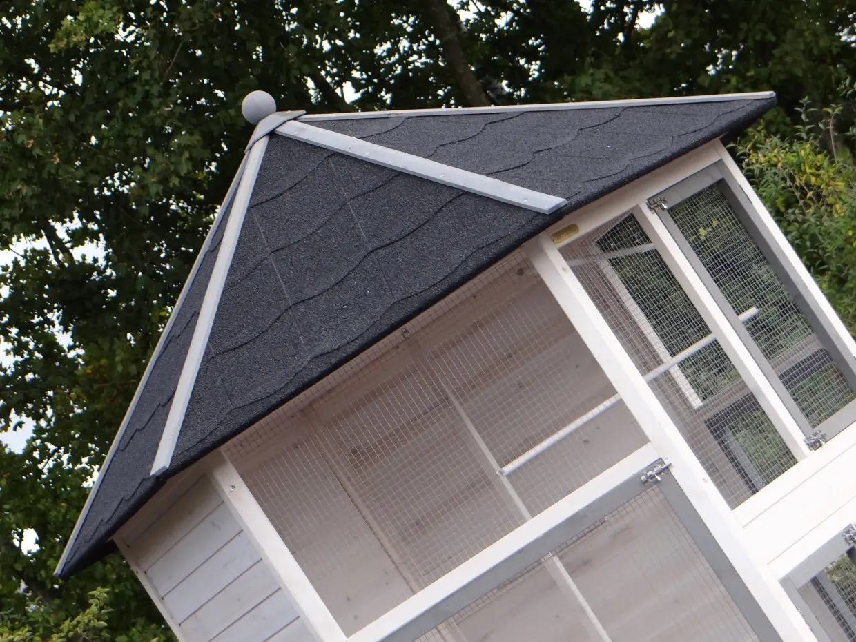 - Le toit de cette cage magnifique est soigneusement fini avec bitume en ardoise
