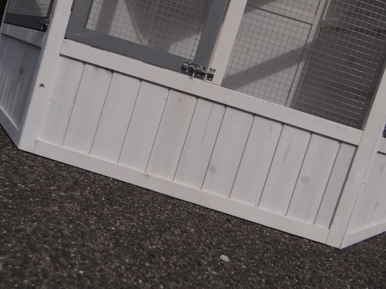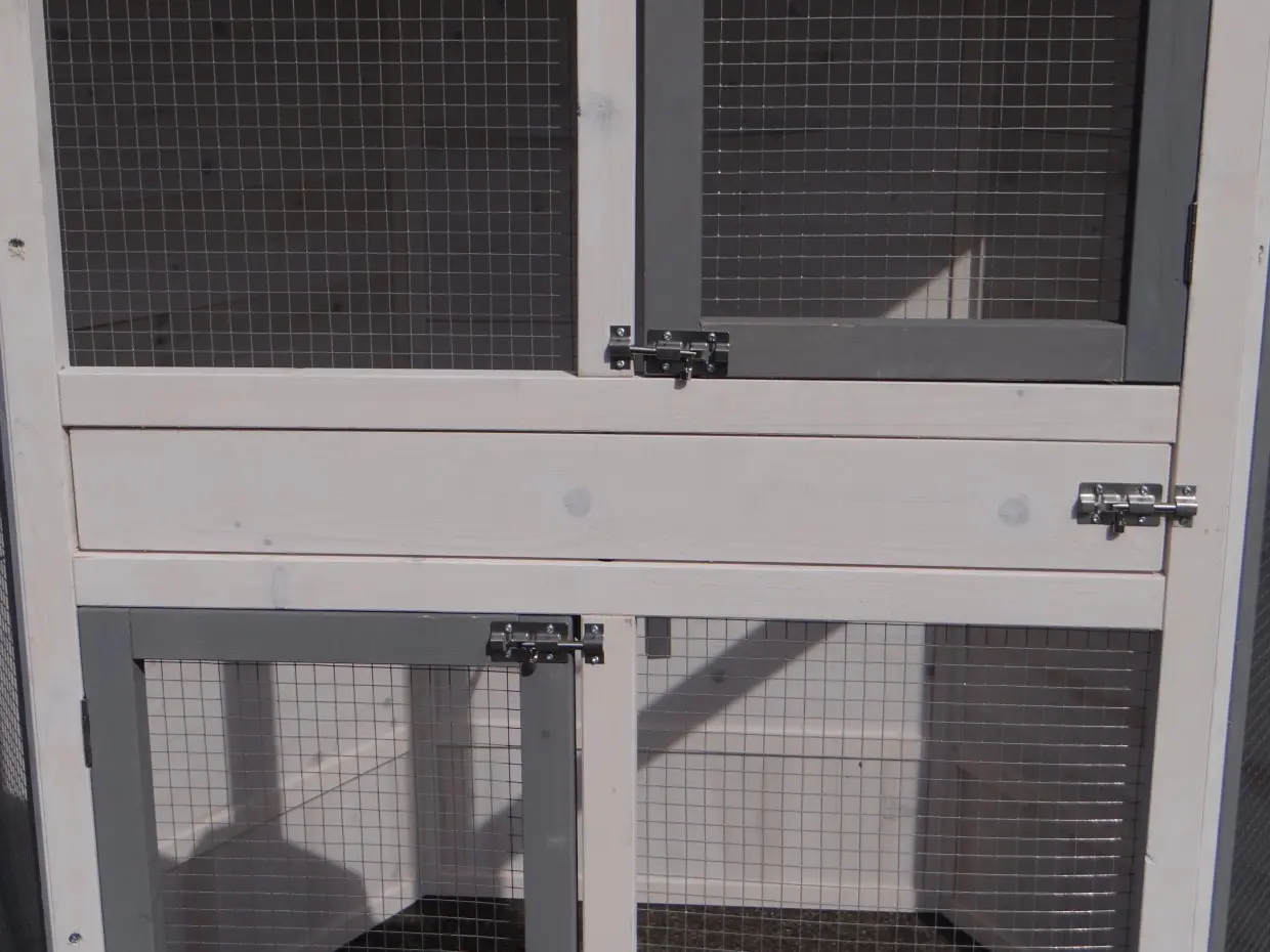 Il est conseillé de traiter périodiquement les charnières et les serrures avec un spray en silicone ou un spray pour serrures pour éviter la rouille et la corrosion. Si l'animal n'est pas dans un endroit abrité, nous vous conseillons d'ancrer l'enclos.