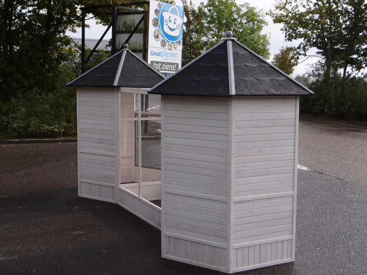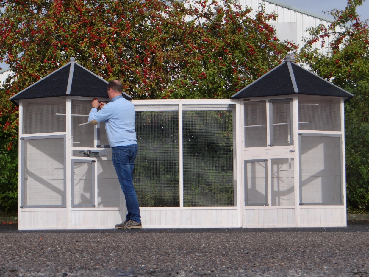 La volière Evy est une combinaison vraiment splendide pour vos oiseaux. Elle se compose de deux volières reliées par un enclos central, formant ainsi une grande volière extérieure unique, dotée de nombreuses portes. La volière Evy, de forme hexagonale, comprend au total quatre nichoirs et dix perchoirs. Elle peut être agrandie à l’infini grâce aux extensions Evy supplémentaires.