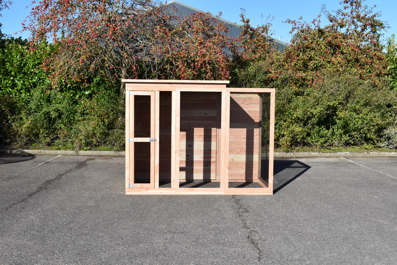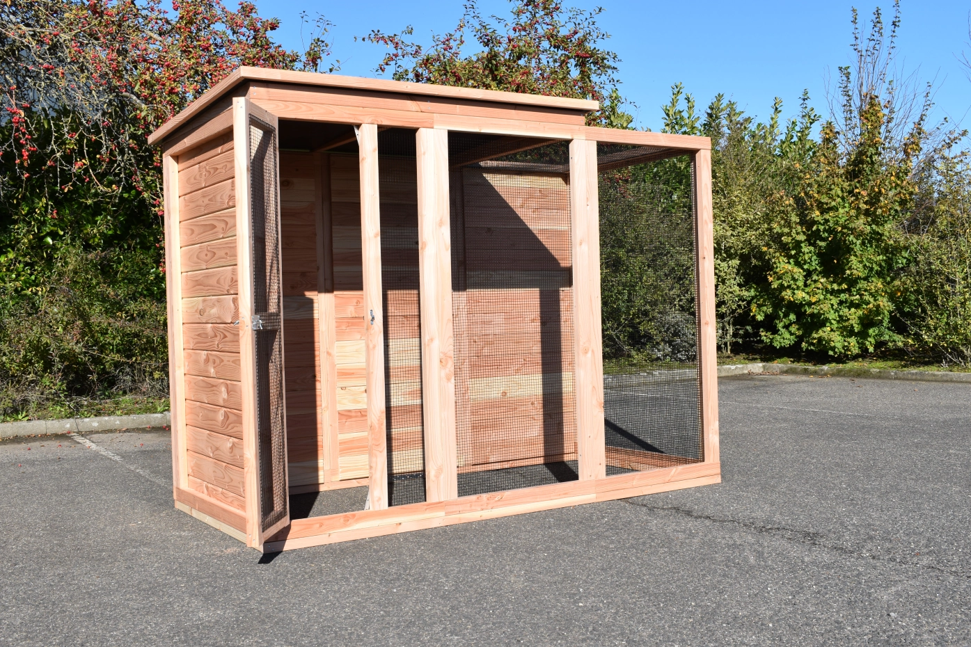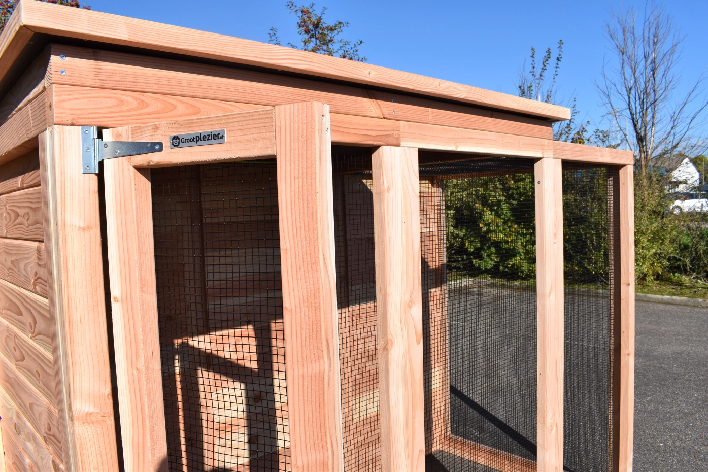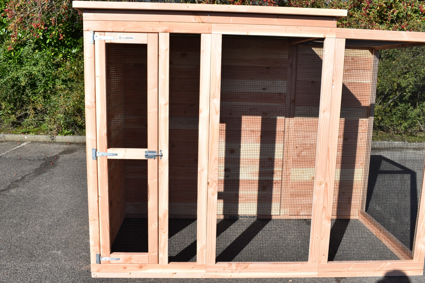 La volière Flex 3.1+ est une belle volière de base. Le pigeonnier est fabriqué en sapin Douglas durable qui a une longue durée de vie d'environ 15 ans. Il n'est pas nécessaire de traiter le bois. Cependant, il deviendra gris au bout de quelques mois. Pour éviter cela, vous pouvez appliquer de l'huile de douglas sur le pigeonnier.