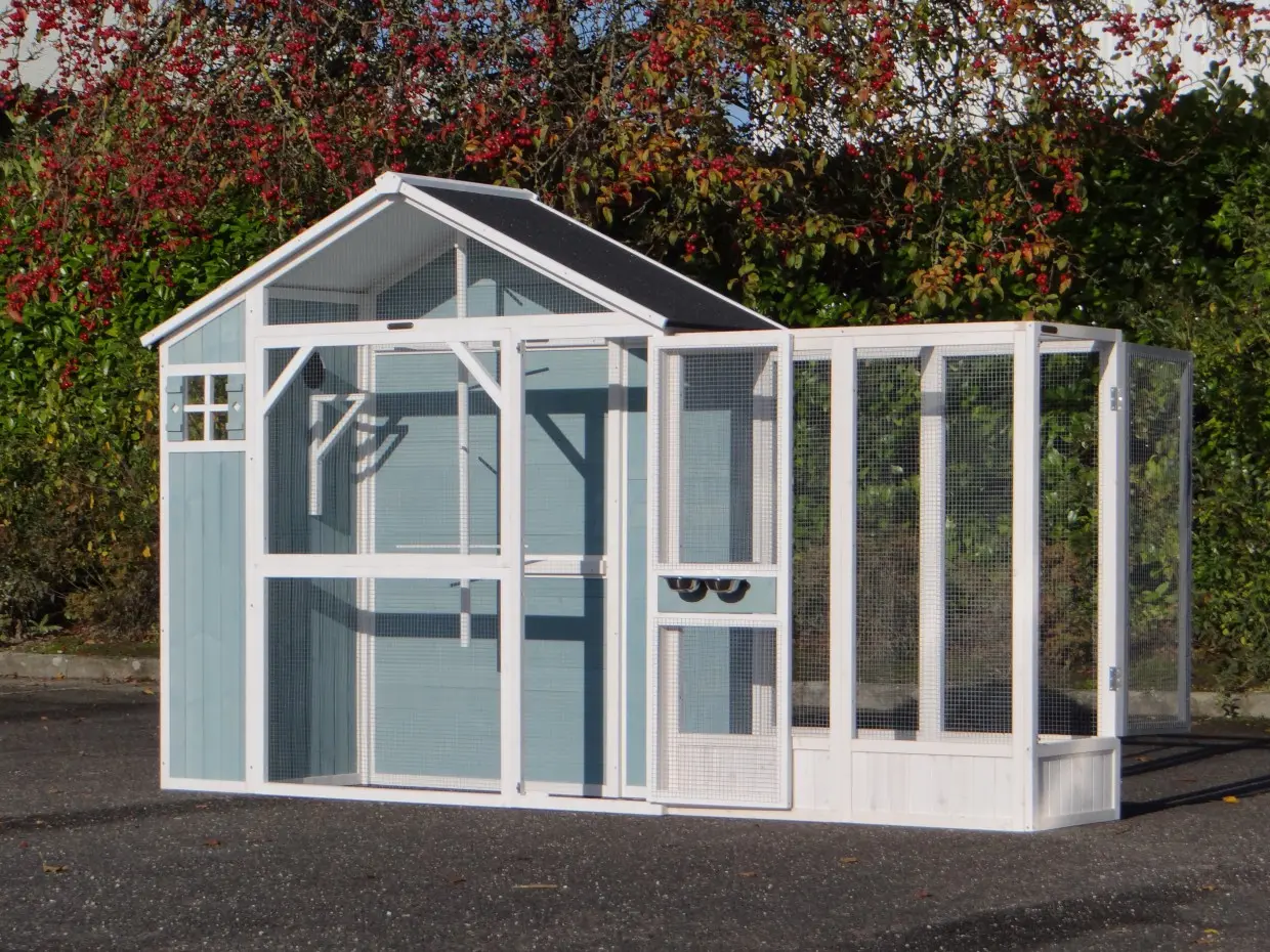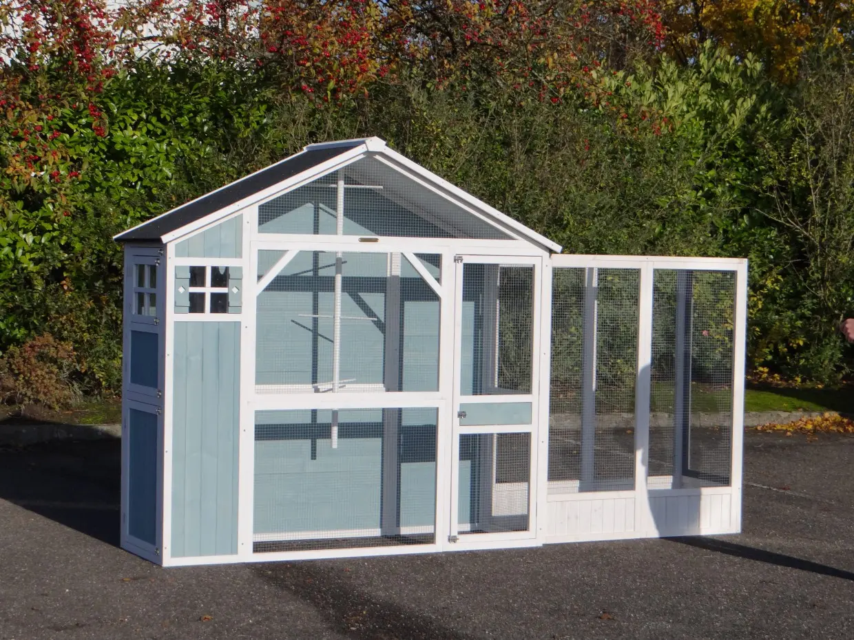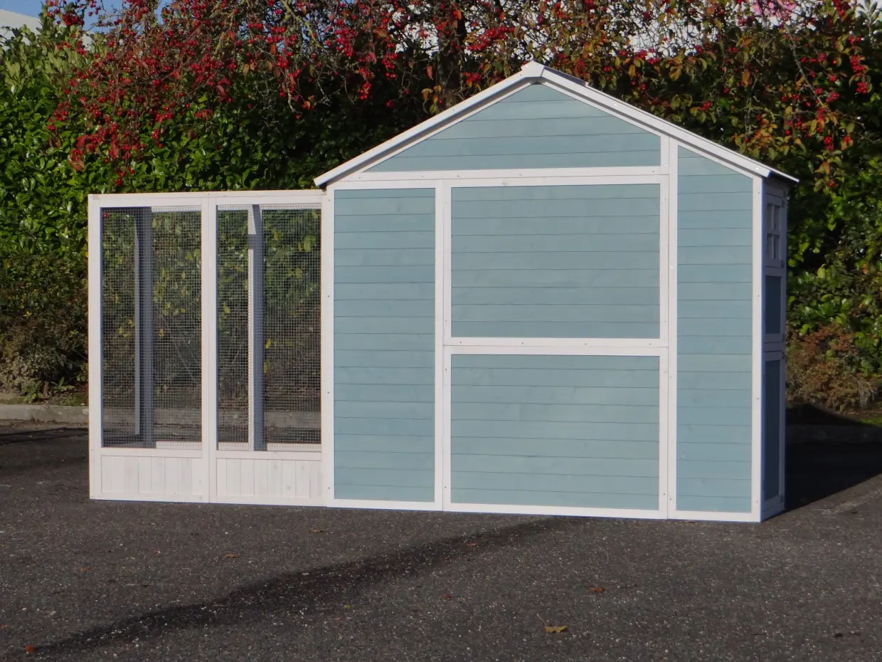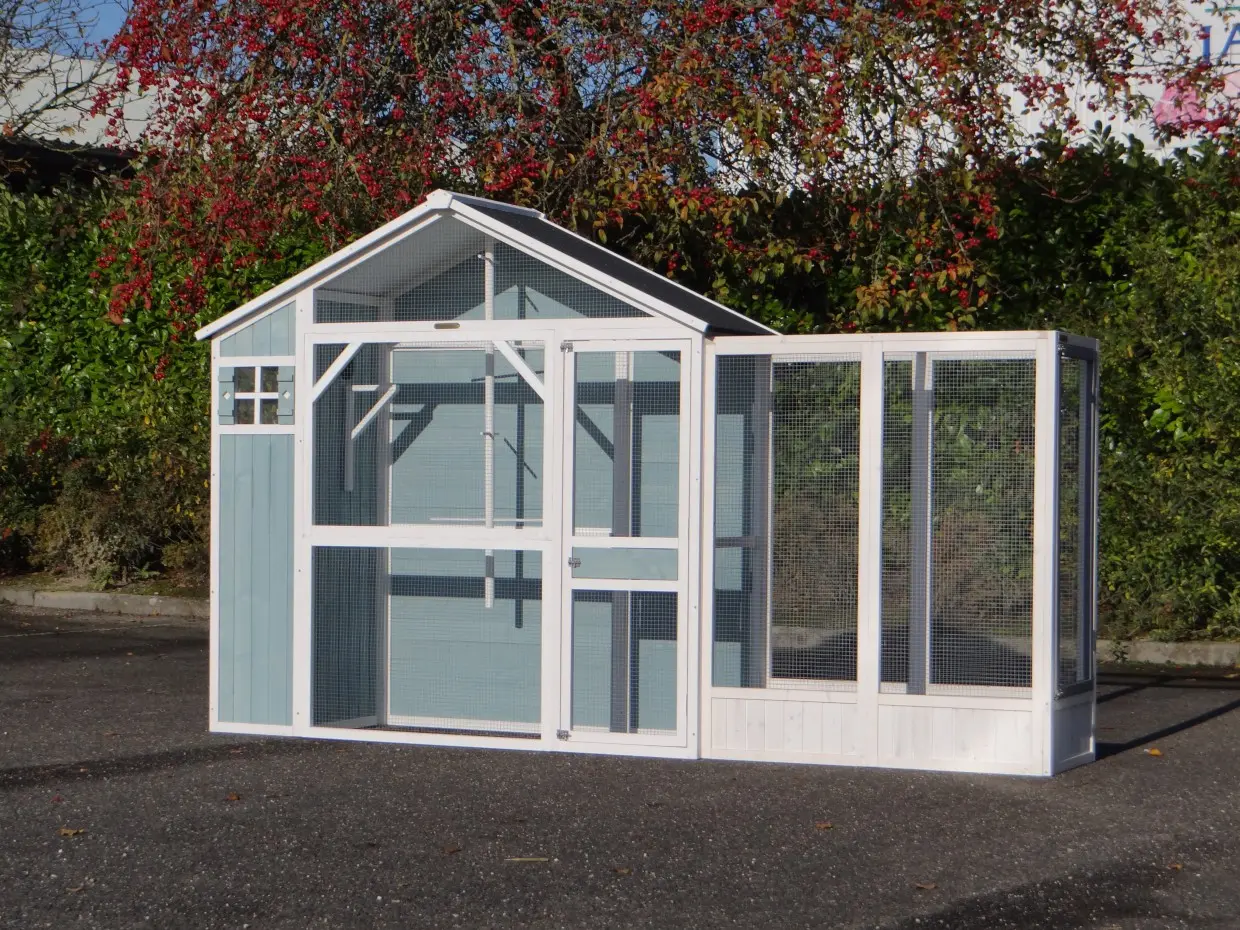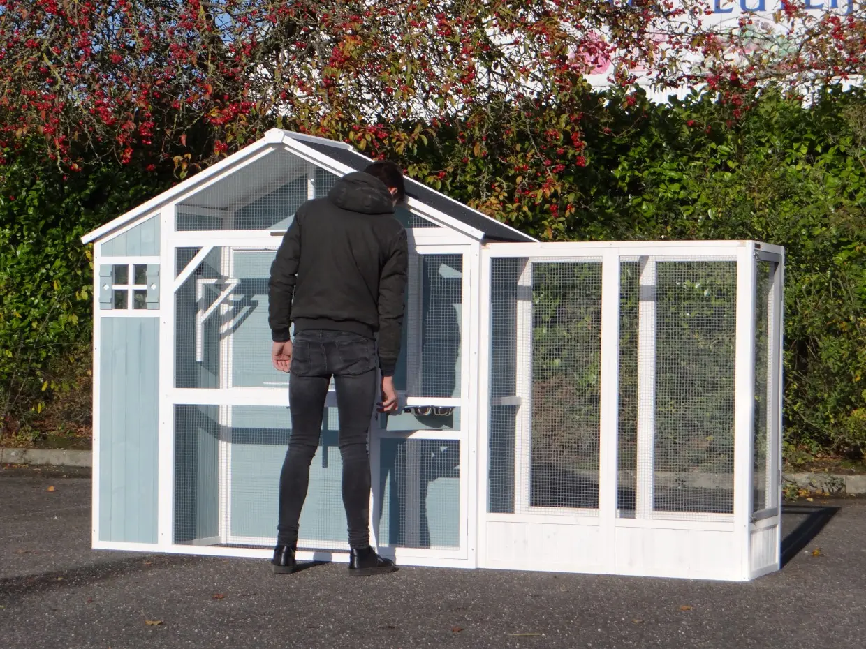 Attention : l’enclos possède une porte grise. Il s’agit donc d’une couleur différente de celle de la volière.